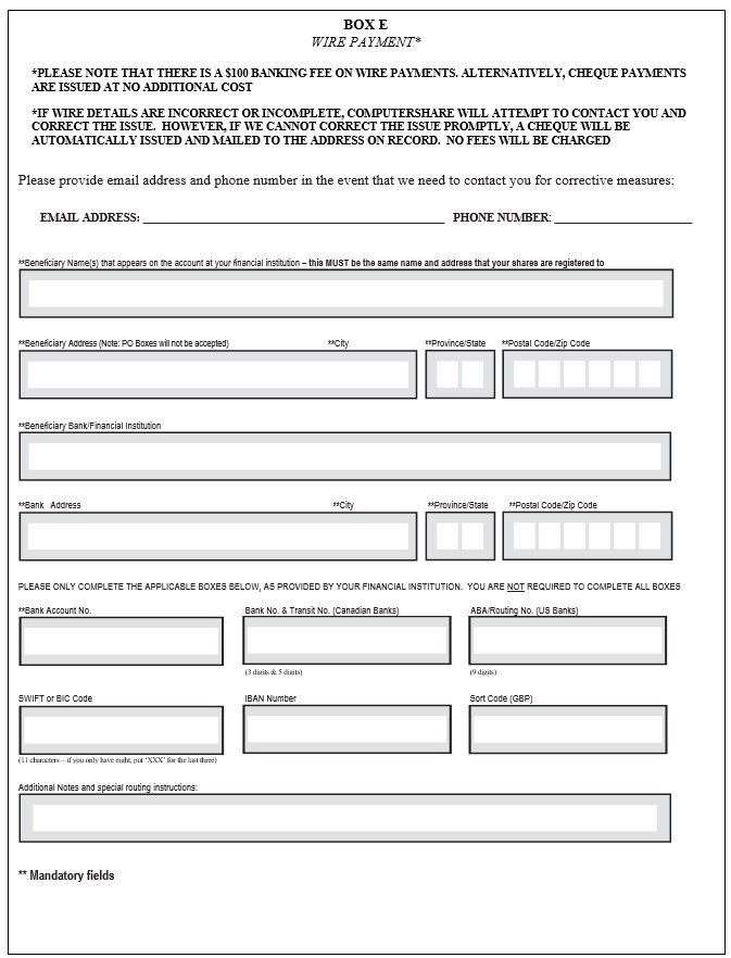 Your attention is directed to the accompanying proxy statement and exhibits which summarize each item to be voted upon. Stockholders who do not expect to attend the Meeting in person and who are entitled to vote are requested to date, sign and return the enclosed proxy in the enclosed envelope, or via the telephone or the Internet by following the instructions provided in the enclosed proxy card, as soon as possible. To be represented at the meeting, proxies must be submitted to the Company's transfer agent, Computershare Trust Company of Canada, Proxy Department, 100 University Avenue, 8th Floor, Toronto, Ontario, M5J 2Y1, or by facsimile (toll free North American facsimile: 1-866-249-7775, international facsimile: 1-416-263-9524), or, if by telephone voting, at 1-866-732-8683, or, if by Internet voting, at https://www.investorvote.com, no later than forty-eight (48) hours, excluding Saturdays, Sundays and holidays, prior to the time of the Meeting or adjournment thereof.