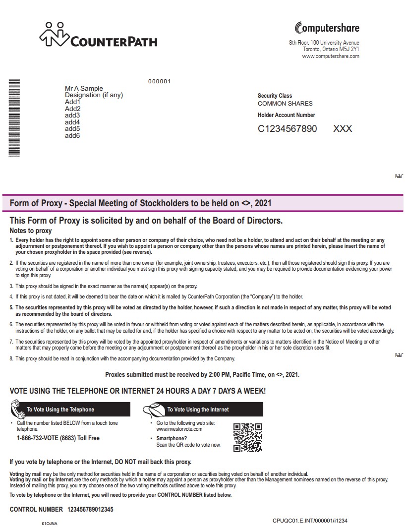 TO THE STOCKHOLDERS OF COUNTERPATH CORPORATION: