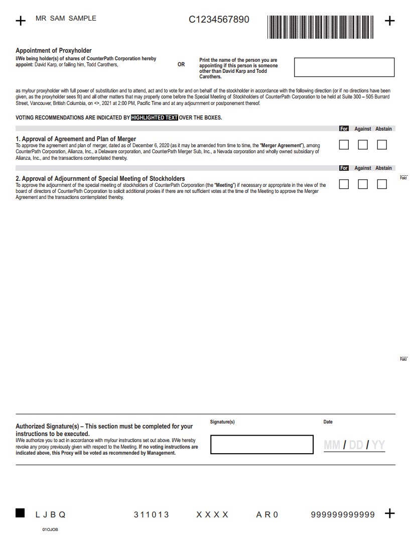In connection with the Merger Agreement, on December 6, 2020, seven CounterPath stockholders, Wesley Clover International Corporation, Owen Matthews, Steven Bruk, Karen Bruk, KMB Trac Two Holdings Ltd., David Karp and Todd Carothers, whom we refer to as the "key stakeholders" in this proxy statement, entered into a voting agreement with Alianza, which we refer to as the "voting agreement" in the accompanying proxy statement, pursuant to which all agreed, among other things, to vote their shares of CounterPath common stock in favor of the proposal to approve the Merger Transaction. Accordingly, because the key stakeholders collectively own approximately 51.1% of the outstanding shares of CounterPath common stock, so long as each remains obligated under the terms of the voting agreement, the Merger Transaction will be approved at the Meeting. The terms of the voting agreement are described in more detail under the section entitled "The Voting Agreement" beginning on page 82 of the accompanying proxy statement.