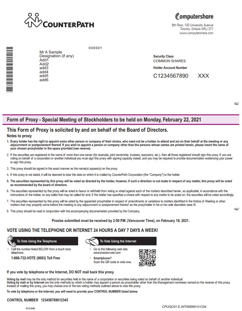 The enclosed proxy is solicited on behalf of our Board of Directors of CounterPath (the "Board") for use at the special meeting of stockholders (the "Meeting") to be held on February 22, 2021 at 2:00 p.m. (Vancouver time) or at any continuation, postponement or adjournment thereof, for the purposes discussed in this proxy statement and in the accompanying Notice of Meeting and any business properly brought before the Meeting. Proxies are solicited to give all stockholders of record an opportunity to vote on matters properly presented at the Meeting. We intend to mail this proxy statement and accompanying proxy card on or about January 22, 2021 to all holders of record of shares of our common stock, being all of the stockholders entitled to vote at the Meeting. The Meeting will be held at Suite 300 - 505 Burrard Street, Vancouver, British Columbia, Canada V7X 1M3.