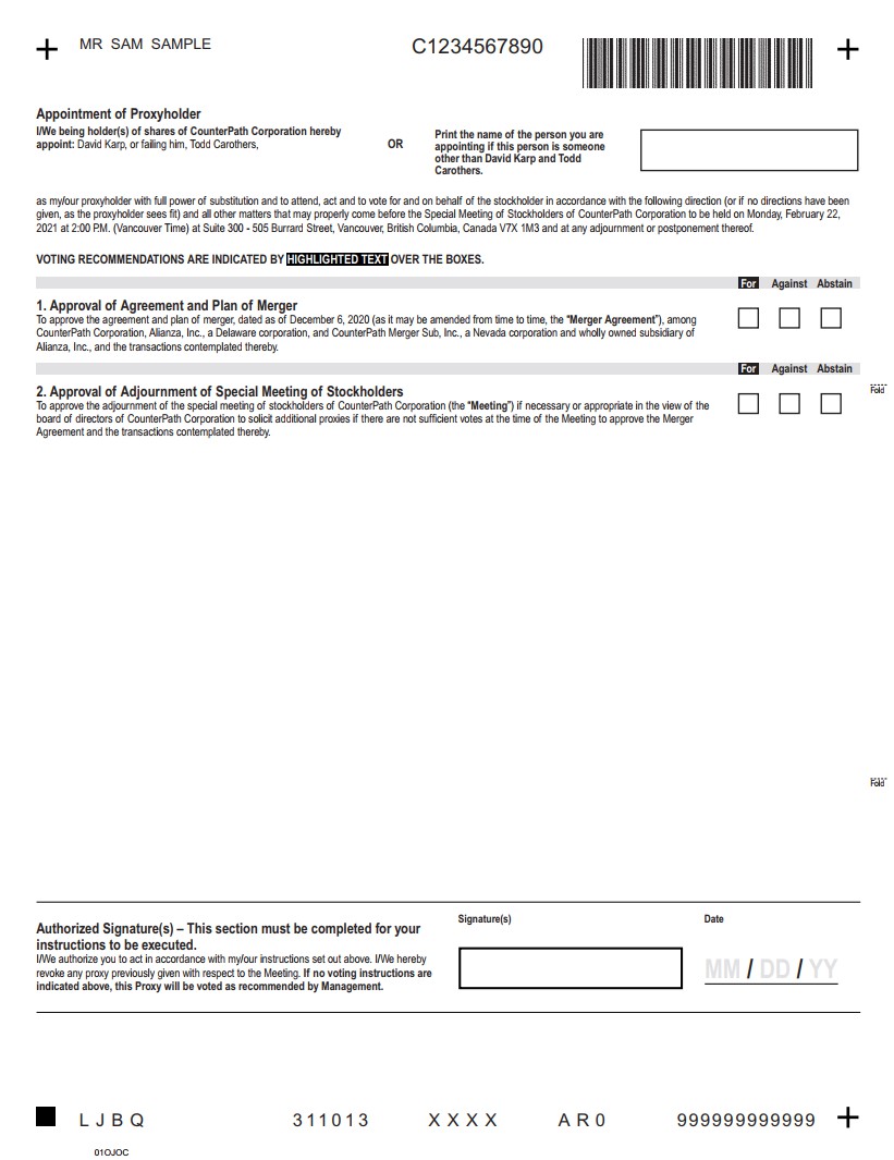 On December 6, 2020, we entered into an agreement and plan of merger, which, as it may be amended from time to time, we refer to as the "Merger Agreement," with Alianza, Inc., a Delaware corporation, which we refer to as "Alianza" in the accompanying proxy statement, and CounterPath Merger Sub, Inc., a Nevada corporation and a wholly owned subsidiary of Alianza, which we refer to as "Merger Sub" in the accompanying proxy statement. Pursuant to the terms of the Merger Agreement, Merger Sub will merge with and into CounterPath, which we refer to as the "Merger" in the accompanying proxy statement, with CounterPath continuing as the surviving corporation and becoming a wholly owned subsidiary of Alianza. If the Merger is completed, you will not own any shares of the surviving corporation and will instead be entitled to receive $3.49 in cash, without interest and less any applicable withholding taxes, for each share of CounterPath common stock you own at the effective time of the Merger. At the special meeting, we will ask you to consider and vote upon a proposal to approve the Merger Agreement by and among CounterPath, Alianza and Merger Sub, thereby approving the Merger, and certain other matters as set forth in the stockholder notice and the accompanying proxy statement.
