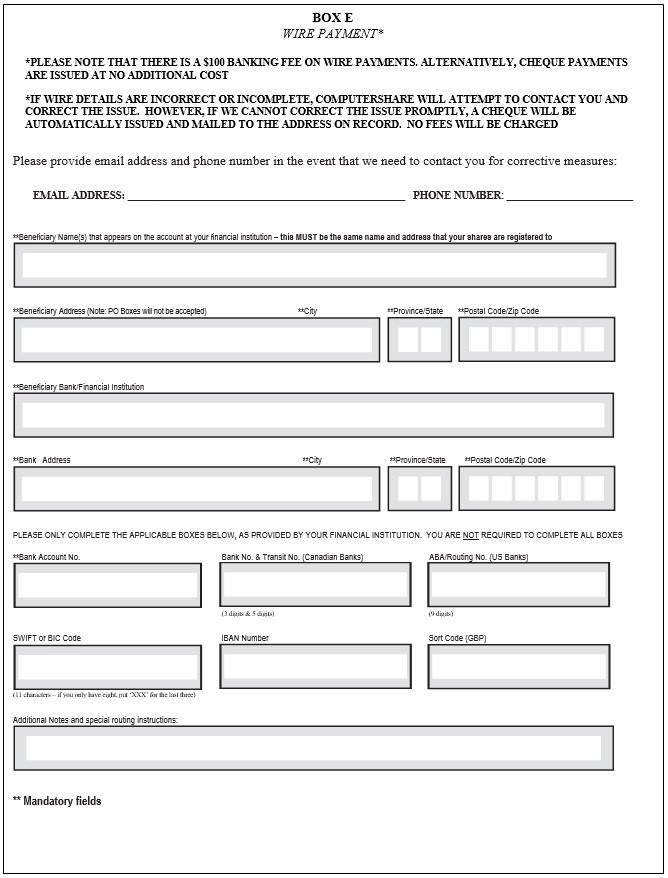Your attention is directed to the accompanying proxy statement and exhibits which summarize each item to be voted upon. Stockholders who do not expect to attend the Meeting in person and who are entitled to vote are requested to date, sign and return the enclosed proxy in the enclosed envelope, or via the telephone or the Internet by following the instructions provided in the enclosed proxy card, as soon as possible. To be represented at the meeting, proxies must be submitted to the Company's transfer agent, Computershare Trust Company of Canada, Proxy Department, 100 University Avenue, 8th Floor, Toronto, Ontario, M5J 2Y1, or by facsimile (toll free North American facsimile: 1-866-249-7775, international facsimile: 1-416-263-9524), or, if by telephone voting, at 1-866-732-8683, or, if by Internet voting, at https://www.investorvote.com, no later than forty-eight (48) hours, excluding Saturdays, Sundays and holidays, prior to the time of the Meeting or adjournment thereof.