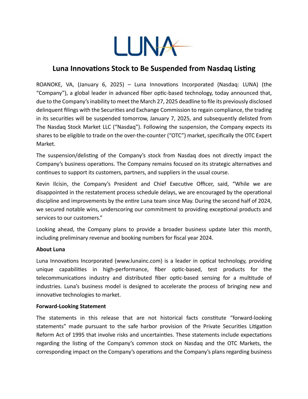 Luna Innovations Stock to Be Suspended from Nasdaq Listing ROANOKE, VA, (January 6, 2025) – Luna Innovations Incorporated (Nasdaq: LUNA) (the “Company”), a global leader in advanced fiber optic-based technology, today announced that, due to the Company’s inability to meet the March 27, 2025 deadline to file its previously disclosed delinquent filings with the Securities and Exchange Commission to regain compliance, the trading in its securities will be suspended tomorrow, January 7, 2025, and subsequently delisted from The Nasdaq Stock Market LLC (“Nasdaq”). Following the suspension, the Company expects its shares to be eligible to trade on the over-the-counter (“OTC”) market, specifically the OTC Expert Market. The suspension/delisting of the Company’s stock from Nasdaq does not directly impact the Company’s business operations. The Company remains focused on its strategic alternatives and continues to support its customers, partners, and suppliers in the usual course. Kevin Ilcisin, the Company’s President and Chief Executive Officer, said, “While we are disappointed in the restatement process schedule delays, we are encouraged by the operational discipline and improvements by the entire Luna team since May. During the second half of 2024, we secured notable wins, underscoring our commitment to providing exceptional products and services to our customers.” Looking ahead, the Company plans to provide a broader business update later this month, including preliminary revenue and booking numbers for fiscal year 2024. About Luna Luna Innovations Incorporated (www.lunainc.com) is a leader in optical technology, providing unique capabilities in high-performance, fiber optic-based, test products for the telecommunications industry and distributed fiber optic-based sensing for a multitude of industries. Luna’s business model is designed to accelerate the process of bringing new and innovative technologies to market. Forward-Looking Statement The statements in this release that are not historical facts constitute “forward-looking statements” made pursuant to the safe harbor provision of the Private Securities Litigation Reform Act of 1995 that involve risks and uncertainties. These statements include expectations regarding the listing of the Company’s common stock on Nasdaq and the OTC Markets, the corresponding impact on the Company’s operations and the Company’s plans regarding business
