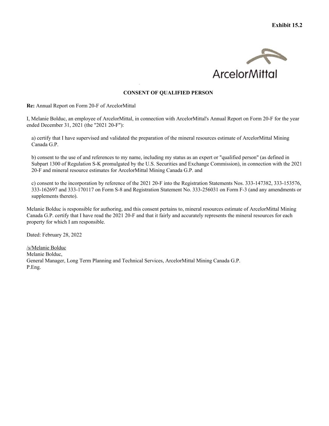 Exhibit 15.2 CONSENT OF QUALIFIED PERSON Re: Annual Report on Form 20-F of ArcelorMittal I, Melanie Bolduc, an employee of ArcelorMittal, in connection with ArcelorMittal's Annual Report on Form 20-F for the year ended December 31, 2021 (the "2021 20-F"): a) certify that I have supervised and validated the preparation of the mineral resources estimate of ArcelorMittal Mining Canada G.P. b) consent to the use of and references to my name, including my status as an expert or "qualified person" (as defined in Subpart 1300 of Regulation S-K promulgated by the U.S. Securities and Exchange Commission), in connection with the 2021 20-F and mineral resource estimates for ArcelorMittal Mining Canada G.P. and c) consent to the incorporation by reference of the 2021 20-F into the Registration Statements Nos. 333-147382, 333-153576, 333-162697 and 333-170117 on Form S-8 and Registration Statement No. 333-256031 on Form F-3 (and any amendments or supplements thereto). Melanie Bolduc is responsible for authoring, and this consent pertains to, mineral resources estimate of ArcelorMittal Mining Canada G.P. certify that I have read the 2021 20-F and that it fairly and accurately represents the mineral resources for each property for which I am responsible. Dated: February 28, 2022 /s/Melanie Bolduc Melanie Bolduc, General Manager, Long Term Planning and Technical Services, ArcelorMittal Mining Canada G.P. P.Eng.