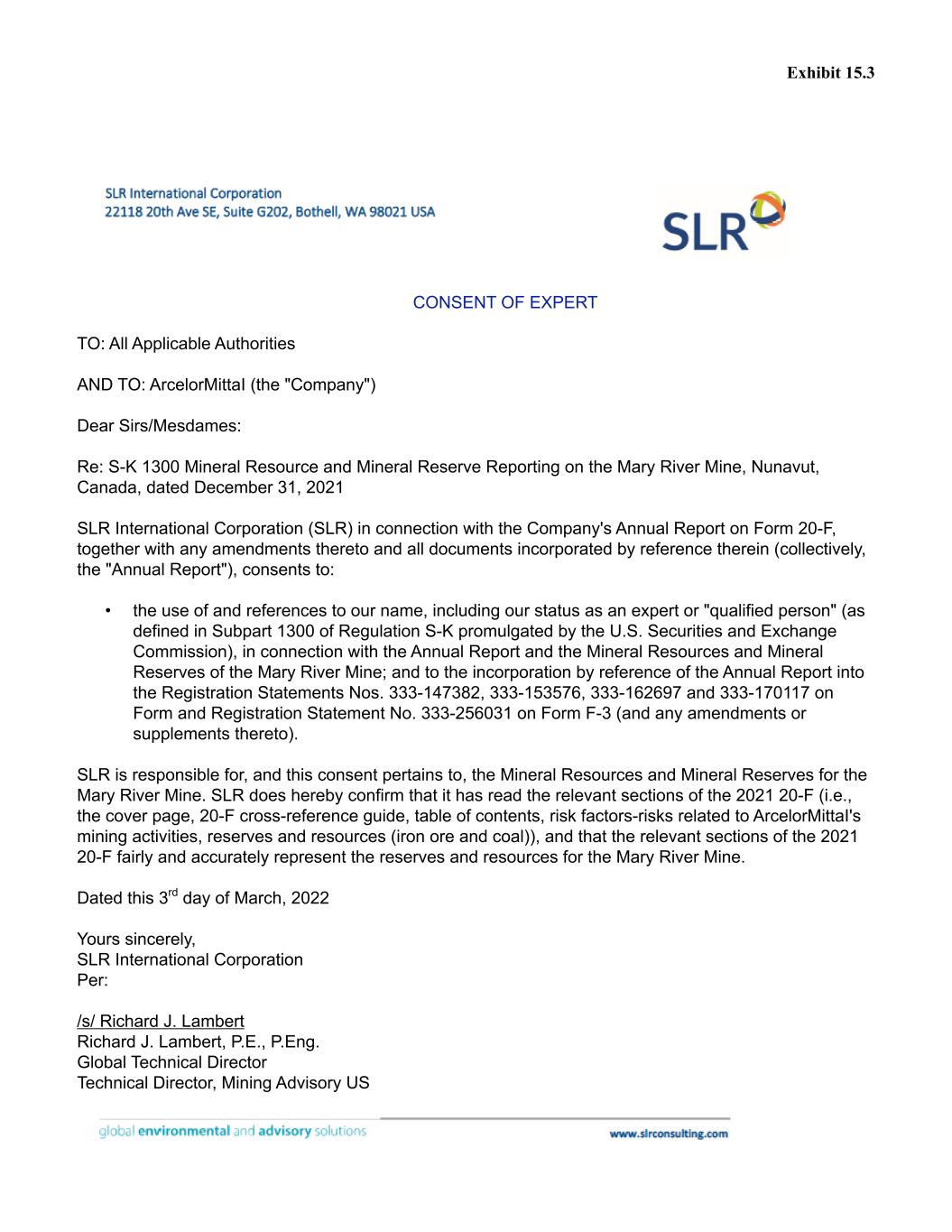 Exhibit 15.3 CONSENT OF EXPERT TO: All Applicable Authorities AND TO: ArcelorMittaI (the "Company") Dear Sirs/Mesdames: Re: S-K 1300 Mineral Resource and Mineral Reserve Reporting on the Mary River Mine, Nunavut, Canada, dated December 31, 2021 SLR International Corporation (SLR) in connection with the Company's Annual Report on Form 20-F, together with any amendments thereto and all documents incorporated by reference therein (collectively, the "Annual Report"), consents to: • the use of and references to our name, including our status as an expert or "qualified person" (as defined in Subpart 1300 of Regulation S-K promulgated by the U.S. Securities and Exchange Commission), in connection with the Annual Report and the Mineral Resources and Mineral Reserves of the Mary River Mine; and to the incorporation by reference of the Annual Report into the Registration Statements Nos. 333-147382, 333-153576, 333-162697 and 333-170117 on Form and Registration Statement No. 333-256031 on Form F-3 (and any amendments or supplements thereto). SLR is responsible for, and this consent pertains to, the Mineral Resources and Mineral Reserves for the Mary River Mine. SLR does hereby confirm that it has read the relevant sections of the 2021 20-F (i.e., the cover page, 20-F cross-reference guide, table of contents, risk factors-risks related to ArcelorMittaI's mining activities, reserves and resources (iron ore and coal)), and that the relevant sections of the 2021 20-F fairly and accurately represent the reserves and resources for the Mary River Mine. Dated this 3rd day of March, 2022 Yours sincerely, SLR International Corporation Per: /s/ Richard J. Lambert Richard J. Lambert, P.E., P.Eng. Global Technical Director Technical Director, Mining Advisory US