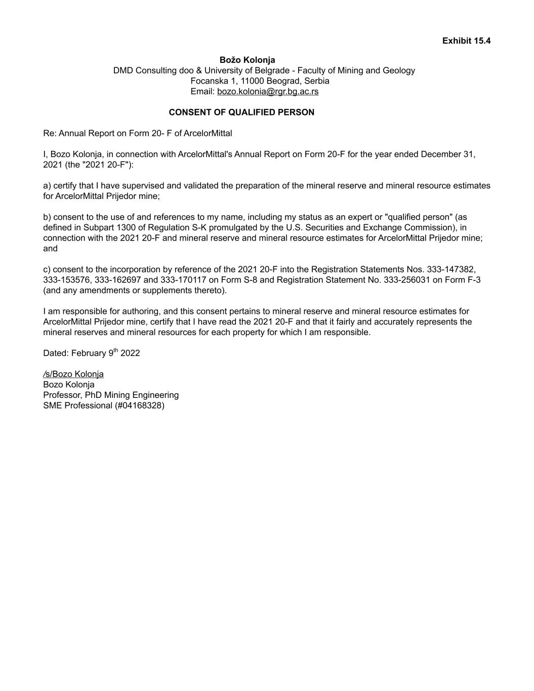 Exhibit 15.4 Božo Kolonja DMD Consulting doo & University of Belgrade - Faculty of Mining and Geology Focanska 1, 11000 Beograd, Serbia Email: bozo.kolonia@rgr.bg.ac.rs CONSENT OF QUALIFIED PERSON Re: Annual Report on Form 20- F of ArcelorMittal I, Bozo Kolonja, in connection with ArcelorMittal's Annual Report on Form 20-F for the year ended December 31, 2021 (the "2021 20-F"): a) certify that I have supervised and validated the preparation of the mineral reserve and mineral resource estimates for ArcelorMittal Prijedor mine; b) consent to the use of and references to my name, including my status as an expert or "qualified person" (as defined in Subpart 1300 of Regulation S-K promulgated by the U.S. Securities and Exchange Commission), in connection with the 2021 20-F and mineral reserve and mineral resource estimates for ArcelorMittal Prijedor mine; and c) consent to the incorporation by reference of the 2021 20-F into the Registration Statements Nos. 333-147382, 333-153576, 333-162697 and 333-170117 on Form S-8 and Registration Statement No. 333-256031 on Form F-3 (and any amendments or supplements thereto). I am responsible for authoring, and this consent pertains to mineral reserve and mineral resource estimates for ArcelorMittal Prijedor mine, certify that I have read the 2021 20-F and that it fairly and accurately represents the mineral reserves and mineral resources for each property for which I am responsible. Dated: February 9th 2022 /s/Bozo Kolonja Bozo Kolonja Professor, PhD Mining Engineering SME Professional (#04168328)