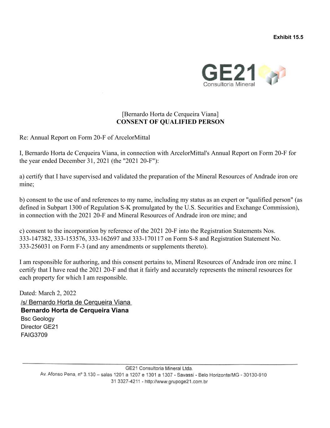 Exhibit 15.5 [Bernardo Horta de Cerqueira Viana] CONSENT OF QUALIFIED PERSON Re: Annual Report on Form 20-F of ArcelorMittal I, Bernardo Horta de Cerqueira Viana, in connection with ArcelorMittal's Annual Report on Form 20-F for the year ended December 31, 2021 (the "2021 20-F"): a) certify that I have supervised and validated the preparation of the Mineral Resources of Andrade iron ore mine; b) consent to the use of and references to my name, including my status as an expert or "qualified person" (as defined in Subpart 1300 of Regulation S-K promulgated by the U.S. Securities and Exchange Commission), in connection with the 2021 20-F and Mineral Resources of Andrade iron ore mine; and c) consent to the incorporation by reference of the 2021 20-F into the Registration Statements Nos. 333-147382, 333-153576, 333-162697 and 333-170117 on Form S-8 and Registration Statement No. 333-256031 on Form F-3 (and any amendments or supplements thereto). I am responsible for authoring, and this consent pertains to, Mineral Resources of Andrade iron ore mine. I certify that I have read the 2021 20-F and that it fairly and accurately represents the mineral resources for each property for which I am responsible. Dated: March 2, 2022 /s/ Bernardo Horta de Cerqueira Viana Bernardo Horta de Cerqueira Viana Bsc Geology Director GE21 FAIG3709