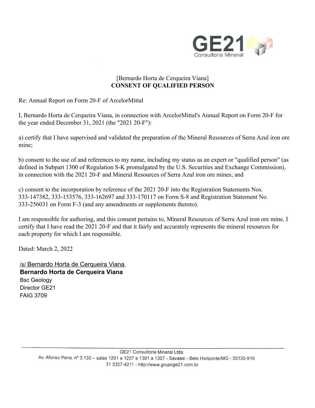 [Bernardo Horta de Cerqueira Viana] CONSENT OF QUALIFIED PERSON Re: Annual Report on Form 20-F of ArcelorMittal I, Bernardo Horta de Cerqueira Viana, in connection with ArcelorMittal's Annual Report on Form 20-F for the year ended December 31, 2021 (the "2021 20-F"): a) certify that I have supervised and validated the preparation of the Mineral Resources of Serra Azul iron ore mine; b) consent to the use of and references to my name, including my status as an expert or "qualified person" (as defined in Subpart 1300 of Regulation S-K promulgated by the U.S. Securities and Exchange Commission), in connection with the 2021 20-F and Mineral Resources of Serra Azul iron ore mines; and c) consent to the incorporation by reference of the 2021 20-F into the Registration Statements Nos. 333-147382, 333-153576, 333-162697 and 333-170117 on Form S-8 and Registration Statement No. 333-256031 on Form F-3 (and any amendments or supplements thereto). I am responsible for authoring, and this consent pertains to, Mineral Resources of Serra Azul iron ore mine. I certify that I have read the 2021 20-F and that it fairly and accurately represents the mineral resources for each property for which I am responsible. Dated: March 2, 2022 /s/ Bernardo Horta de Cerqueira Viana Bernardo Horta de Cerqueira Viana Bsc Geology Director GE21 FAIG 3709
