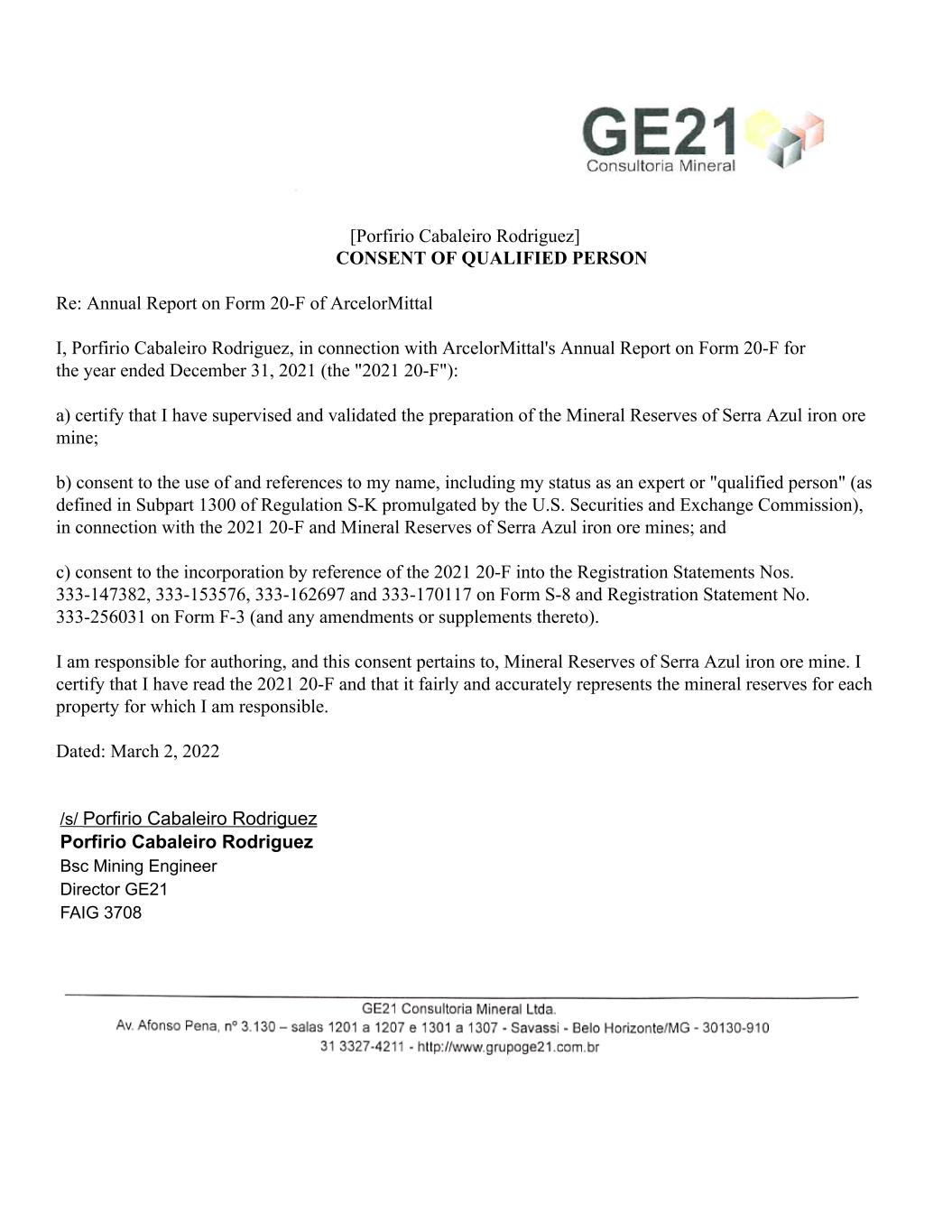 [Porfirio Cabaleiro Rodriguez] CONSENT OF QUALIFIED PERSON Re: Annual Report on Form 20-F of ArcelorMittal I, Porfirio Cabaleiro Rodriguez, in connection with ArcelorMittal's Annual Report on Form 20-F for the year ended December 31, 2021 (the "2021 20-F"): a) certify that I have supervised and validated the preparation of the Mineral Reserves of Serra Azul iron ore mine; b) consent to the use of and references to my name, including my status as an expert or "qualified person" (as defined in Subpart 1300 of Regulation S-K promulgated by the U.S. Securities and Exchange Commission), in connection with the 2021 20-F and Mineral Reserves of Serra Azul iron ore mines; and c) consent to the incorporation by reference of the 2021 20-F into the Registration Statements Nos. 333-147382, 333-153576, 333-162697 and 333-170117 on Form S-8 and Registration Statement No. 333-256031 on Form F-3 (and any amendments or supplements thereto). I am responsible for authoring, and this consent pertains to, Mineral Reserves of Serra Azul iron ore mine. I certify that I have read the 2021 20-F and that it fairly and accurately represents the mineral reserves for each property for which I am responsible. Dated: March 2, 2022 /s/ Porfirio Cabaleiro Rodriguez Porfirio Cabaleiro Rodriguez Bsc Mining Engineer Director GE21 FAIG 3708