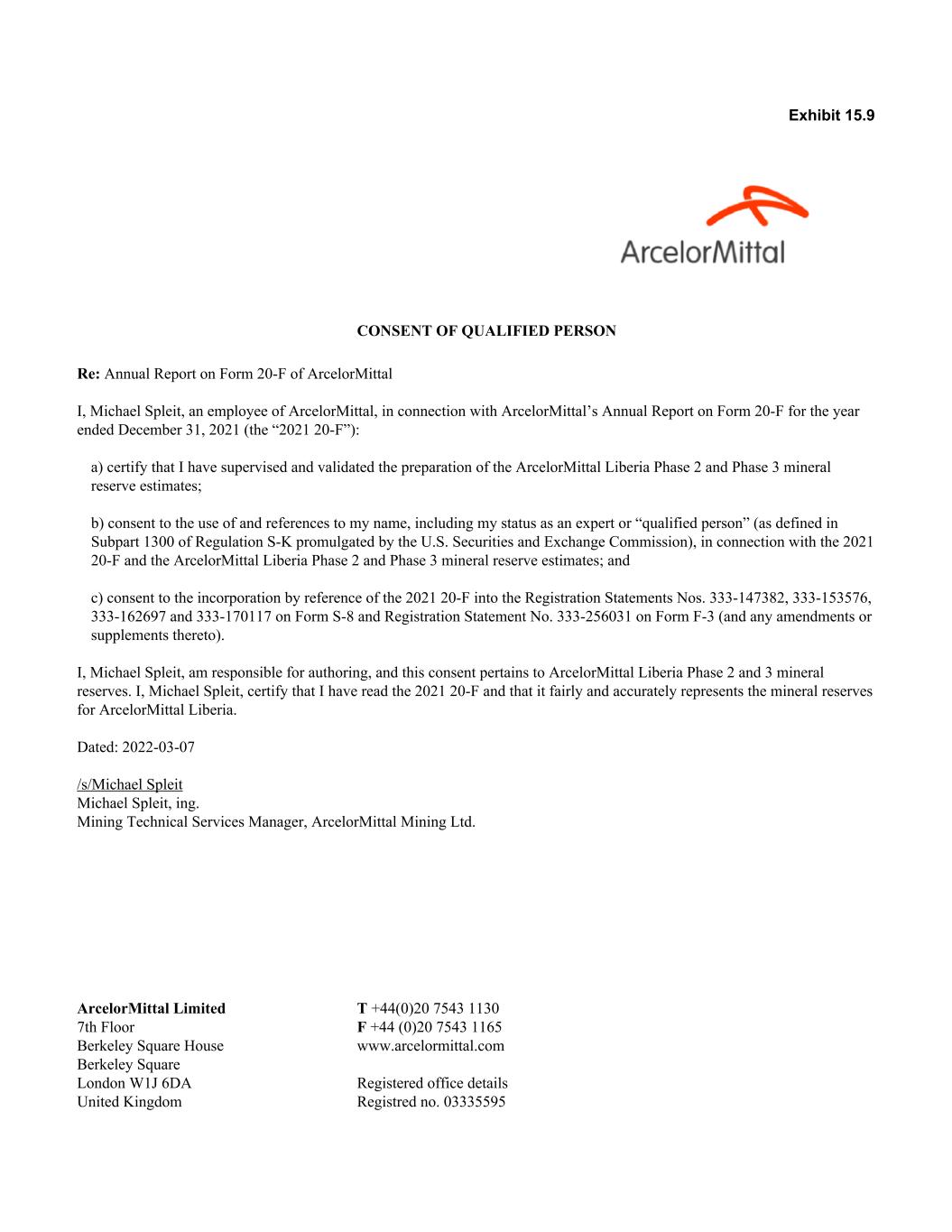 Exhibit 15.9 CONSENT OF QUALIFIED PERSON Re: Annual Report on Form 20-F of ArcelorMittal I, Michael Spleit, an employee of ArcelorMittal, in connection with ArcelorMittal’s Annual Report on Form 20-F for the year ended December 31, 2021 (the “2021 20-F”): a) certify that I have supervised and validated the preparation of the ArcelorMittal Liberia Phase 2 and Phase 3 mineral reserve estimates; b) consent to the use of and references to my name, including my status as an expert or “qualified person” (as defined in Subpart 1300 of Regulation S-K promulgated by the U.S. Securities and Exchange Commission), in connection with the 2021 20-F and the ArcelorMittal Liberia Phase 2 and Phase 3 mineral reserve estimates; and c) consent to the incorporation by reference of the 2021 20-F into the Registration Statements Nos. 333-147382, 333-153576, 333-162697 and 333-170117 on Form S-8 and Registration Statement No. 333-256031 on Form F-3 (and any amendments or supplements thereto). I, Michael Spleit, am responsible for authoring, and this consent pertains to ArcelorMittal Liberia Phase 2 and 3 mineral reserves. I, Michael Spleit, certify that I have read the 2021 20-F and that it fairly and accurately represents the mineral reserves for ArcelorMittal Liberia. Dated: 2022-03-07 /s/Michael Spleit Michael Spleit, ing. Mining Technical Services Manager, ArcelorMittal Mining Ltd. ArcelorMittal Limited T +44(0)20 7543 1130 7th Floor F +44 (0)20 7543 1165 Berkeley Square House www.arcelormittal.com Berkeley Square London W1J 6DA Registered office details United Kingdom Registred no. 03335595