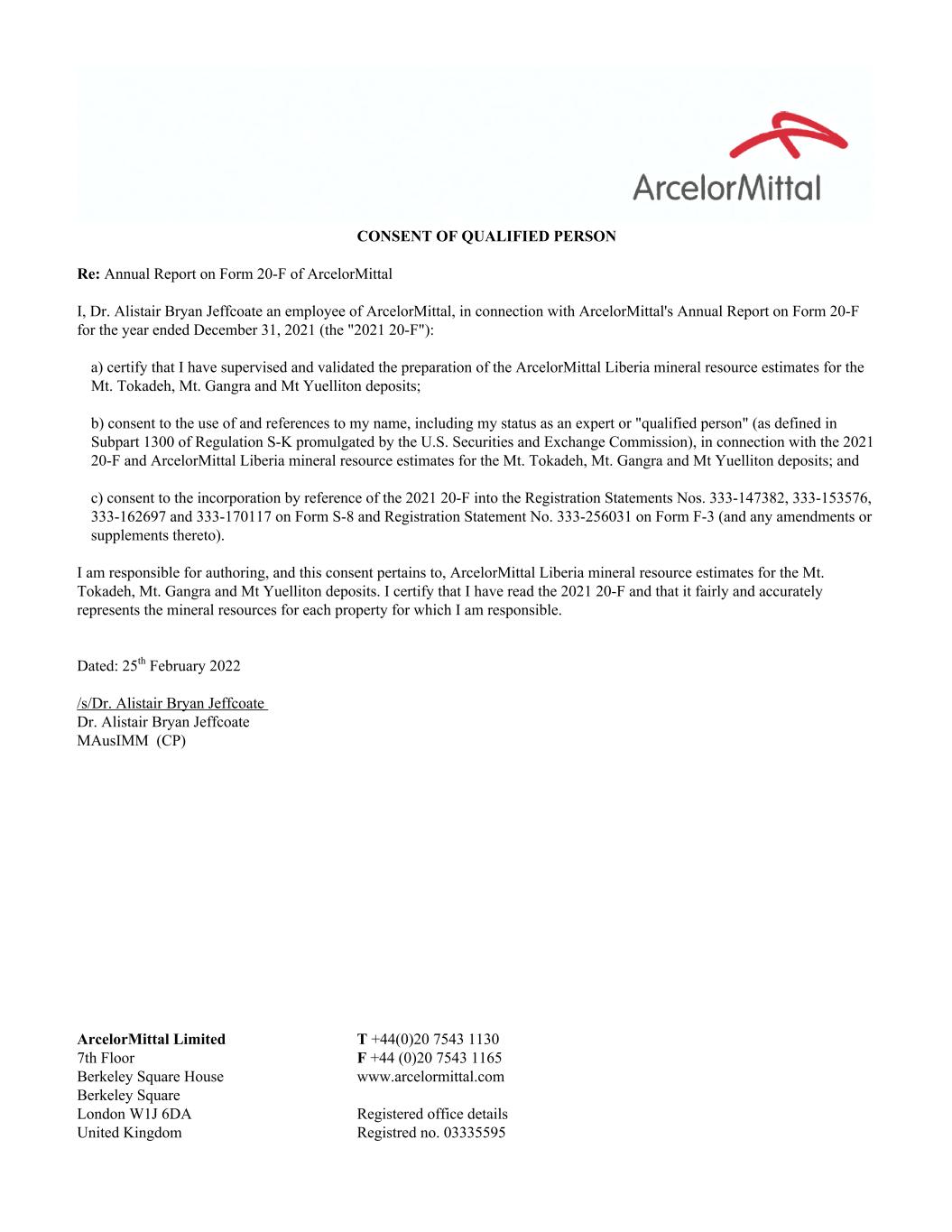 CONSENT OF QUALIFIED PERSON Re: Annual Report on Form 20-F of ArcelorMittal I, Dr. Alistair Bryan Jeffcoate an employee of ArcelorMittal, in connection with ArcelorMittal's Annual Report on Form 20-F for the year ended December 31, 2021 (the "2021 20-F"): a) certify that I have supervised and validated the preparation of the ArcelorMittal Liberia mineral resource estimates for the Mt. Tokadeh, Mt. Gangra and Mt Yuelliton deposits; b) consent to the use of and references to my name, including my status as an expert or "qualified person" (as defined in Subpart 1300 of Regulation S-K promulgated by the U.S. Securities and Exchange Commission), in connection with the 2021 20-F and ArcelorMittal Liberia mineral resource estimates for the Mt. Tokadeh, Mt. Gangra and Mt Yuelliton deposits; and c) consent to the incorporation by reference of the 2021 20-F into the Registration Statements Nos. 333-147382, 333-153576, 333-162697 and 333-170117 on Form S-8 and Registration Statement No. 333-256031 on Form F-3 (and any amendments or supplements thereto). I am responsible for authoring, and this consent pertains to, ArcelorMittal Liberia mineral resource estimates for the Mt. Tokadeh, Mt. Gangra and Mt Yuelliton deposits. I certify that I have read the 2021 20-F and that it fairly and accurately represents the mineral resources for each property for which I am responsible. Dated: 25th February 2022 /s/Dr. Alistair Bryan Jeffcoate Dr. Alistair Bryan Jeffcoate MAusIMM (CP) ArcelorMittal Limited T +44(0)20 7543 1130 7th Floor F +44 (0)20 7543 1165 Berkeley Square House www.arcelormittal.com Berkeley Square London W1J 6DA Registered office details United Kingdom Registred no. 03335595