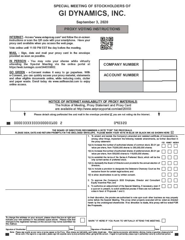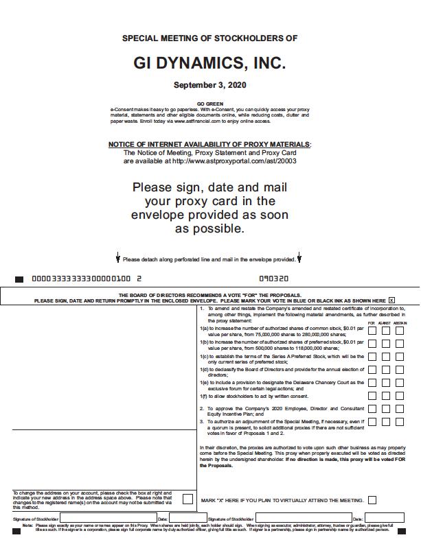 You are cordially invited to attend a Special Meeting of Stockholders (the “Special Meeting”) of GI Dynamics, Inc. (“GI Dynamics” or the “Company”) to be held on September 3, 2020, at 5:00 p.m., United States Eastern Daylight Time (“EDT”). As a result of the public health and travel guidance and concerns due to COVID-19, the Special Meeting will be held virtually via telephone and internet audio streaming. You may vote during the Special Meeting via the online portal at https://web.lumiagm.com/244039802. The attached Notice of Special Meeting and accompanying proxy statement describe the business which the Company will conduct at the Special Meeting and provides information about GI Dynamics that you should consider when you vote your shares of common stock.