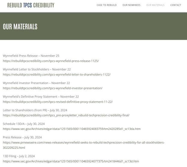 Following the Company’s Friday afternoon disclosure of its failure to comply with a critical Nasdaq Listing Rule due to the late filing of its Quarterly Report on Form 10-Q for the fiscal quarter ended September 30, 2024, the Wynnefield Group is raising serious concerns. TechPrecision has consistently missed SEC filing deadlines for years, signaling a systemic issue that continues to jeopardize stockholders. Adding to this troubling pattern, the Company has disclosed substantial doubt about its ability to continue as a going concern—a warning that demands immediate action and accountability. For these reasons and the reasons outlined in our proxy statement, our letter to stockholders and our investor presentation, TechPrecision stockholders should vote the BLUE proxy card or BLUE voting instruction form to elect our two highly-qualified and exceptional Director nominees, General Victor Eugene “Gene” Renuart, Jr. and Mr. Robert Straus.