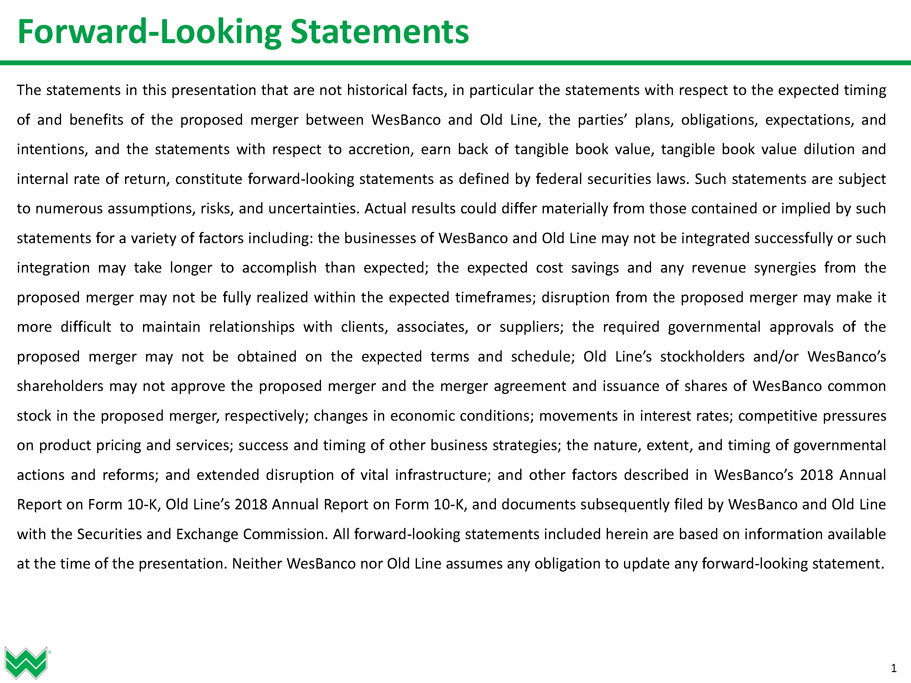 The statements in this presentation that are not historical facts, in particular the statements with respect to the expected timing of and benefits of the proposed merger between WesBanco and Old Line, the parties’ plans, obligations, expectations, and intentions, and the statements with respect to accretion, earn back of tangible book value, tangible book value dilution and internal rate of return, constitute forward - looking statements as defined by federal securities laws . Such statements are subject to numerous assumptions, risks, and uncertainties . Actual results could differ materially from those contained or implied by such statements for a variety of factors including : the businesses of WesBanco and Old Line may not be integrated successfully or such integration may take longer to accomplish than expected ; the expected cost savings and any revenue synergies from the proposed merger may not be fully realized within the expected timeframes ; disruption from the proposed merger may make it more difficult to maintain relationships with clients, associates, or suppliers ; the required governmental approvals of the proposed merger may not be obtained on the expected terms and schedule ; Old Line’s stockholders and/or WesBanco’s shareholders may not approve the proposed merger and the merger agreement and issuance of shares of WesBanco common stock in the proposed merger, respectively ; changes in economic conditions ; movements in interest rates ; competitive pressures on product pricing and services ; success and timing of other business strategies ; the nature, extent, and timing of governmental actions and reforms ; and extended disruption of vital infrastructure ; and other factors described in WesBanco’s 2018 Annual Report on Form 10 - K, Old Line’s 2018 Annual Report on Form 10 - K, and documents subsequently filed by WesBanco and Old Line with the Securities and Exchange Commission . All forward - looking statements included herein are based on information available at the time of the presentation . Neither WesBanco nor Old Line assumes any obligation to update any forward - looking statement . Forward - Looking Statements 1
