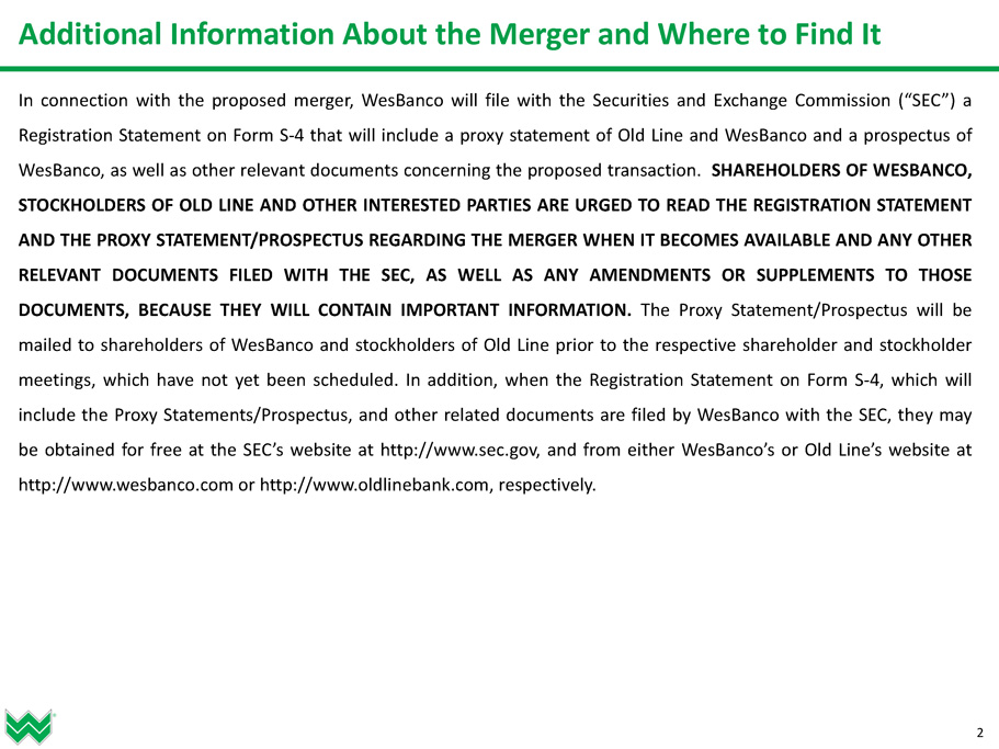 In connection with the proposed merger, WesBanco will file with the Securities and Exchange Commission (“SEC”) a Registration Statement on Form S - 4 that will include a proxy statement of Old Line and WesBanco and a prospectus of WesBanco, as well as other relevant documents concerning the proposed transaction . SHAREHOLDERS OF WESBANCO, STOCKHOLDERS OF OLD LINE AND OTHER INTERESTED PARTIES ARE URGED TO READ THE REGISTRATION STATEMENT AND THE PROXY STATEMENT/PROSPECTUS REGARDING THE MERGER WHEN IT BECOMES AVAILABLE AND ANY OTHER RELEVANT DOCUMENTS FILED WITH THE SEC, AS WELL AS ANY AMENDMENTS OR SUPPLEMENTS TO THOSE DOCUMENTS, BECAUSE THEY WILL CONTAIN IMPORTANT INFORMATION . The Proxy Statement/Prospectus will be mailed to shareholders of WesBanco and stockholders of Old Line prior to the respective shareholder and stockholder meetings, which have not yet been scheduled . In addition, when the Registration Statement on Form S - 4 , which will include the Proxy Statements/Prospectus, and other related documents are filed by WesBanco with the SEC, they may be obtained for free at the SEC’s website at http : // www . sec . gov, and from either WesBanco’s or Old Line’s website at http : // www . wesbanco . com or http : // www . oldlinebank . com, respectively . Additional Information About the Merger and Where to Find It 2