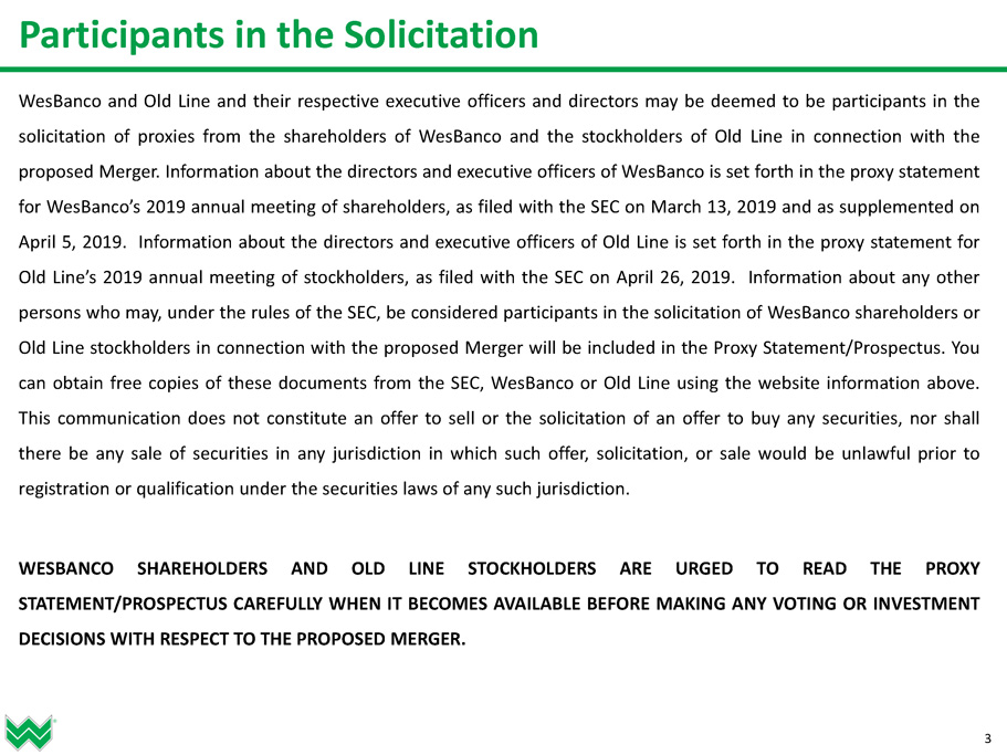 WesBanco and Old Line and their respective executive officers and directors may be deemed to be participants in the solicitation of proxies from the shareholders of WesBanco and the stockholders of Old Line in connection with the proposed Merger . Information about the directors and executive officers of WesBanco is set forth in the proxy statement for WesBanco’s 2019 annual meeting of shareholders, as filed with the SEC on March 13 , 2019 and as supplemented on April 5 , 2019 . Information about the directors and executive officers of Old Line is set forth in the proxy statement for Old Line’s 2019 annual meeting of stockholders, as filed with the SEC on April 26 , 2019 . Information about any other persons who may, under the rules of the SEC, be considered participants in the solicitation of WesBanco shareholders or Old Line stockholders in connection with the proposed Merger will be included in the Proxy Statement/Prospectus . You can obtain free copies of these documents from the SEC, WesBanco or Old Line using the website information above . This communication does not constitute an offer to sell or the solicitation of an offer to buy any securities, nor shall there be any sale of securities in any jurisdiction in which such offer, solicitation, or sale would be unlawful prior to registration or qualification under the securities laws of any such jurisdiction . WESBANCO SHAREHOLDERS AND OLD LINE STOCKHOLDERS ARE URGED TO READ THE PROXY STATEMENT/PROSPECTUS CAREFULLY WHEN IT BECOMES AVAILABLE BEFORE MAKING ANY VOTING OR INVESTMENT DECISIONS WITH RESPECT TO THE PROPOSED MERGER . Participants in the Solicitation 3