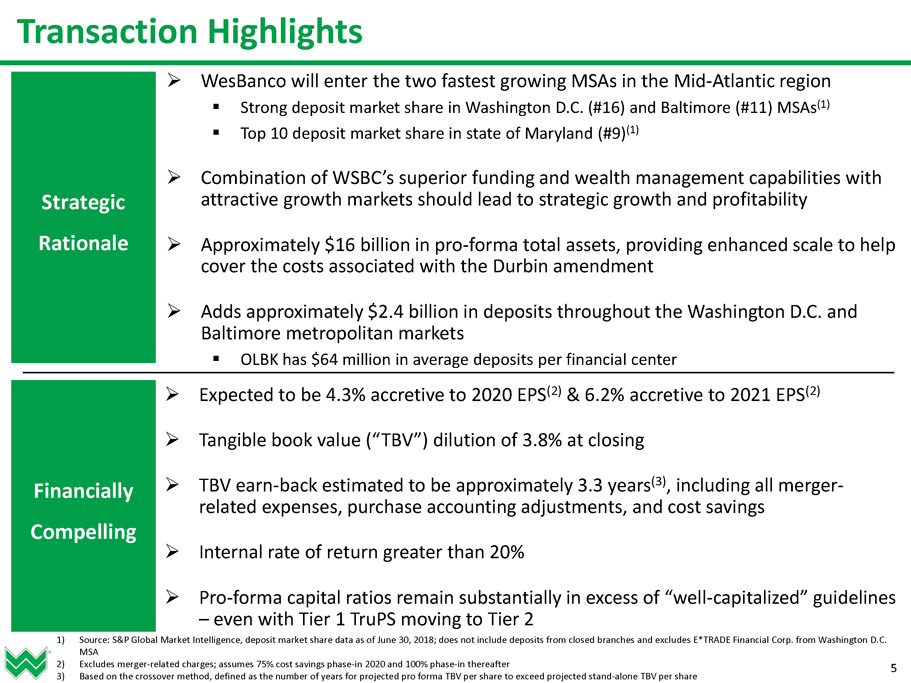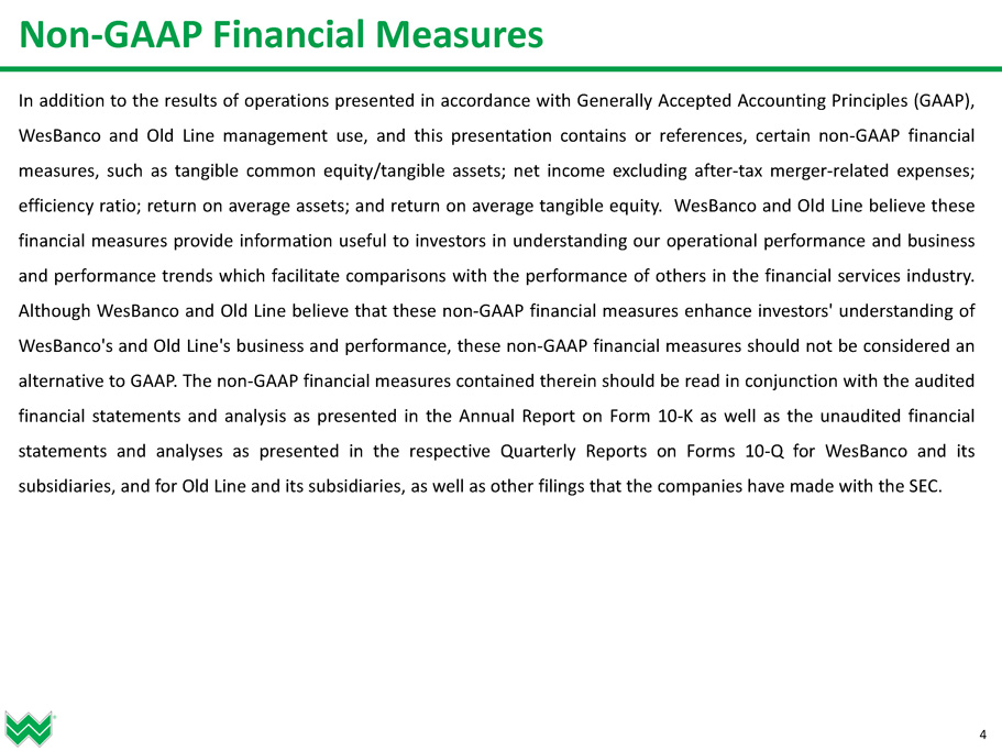 In addition to the results of operations presented in accordance with Generally Accepted Accounting Principles (GAAP), WesBanco and Old Line management use, and this presentation contains or references, certain non - GAAP financial measures, such as tangible common equity/tangible assets ; net income excluding after - tax merger - related expenses ; efficiency ratio ; return on average assets ; and return on average tangible equity . WesBanco and Old Line believe these financial measures provide information useful to investors in understanding our operational performance and business and performance trends which facilitate comparisons with the performance of others in the financial services industry . Although WesBanco and Old Line believe that these non - GAAP financial measures enhance investors' understanding of WesBanco's and Old Line's business and performance, these non - GAAP financial measures should not be considered an alternative to GAAP . The non - GAAP financial measures contained therein should be read in conjunction with the audited financial statements and analysis as presented in the Annual Report on Form 10 - K as well as the unaudited financial statements and analyses as presented in the respective Quarterly Reports on Forms 10 - Q for WesBanco and its subsidiaries, and for Old Line and its subsidiaries, as well as other filings that the companies have made with the SEC . Non - GAAP Financial Measures 4