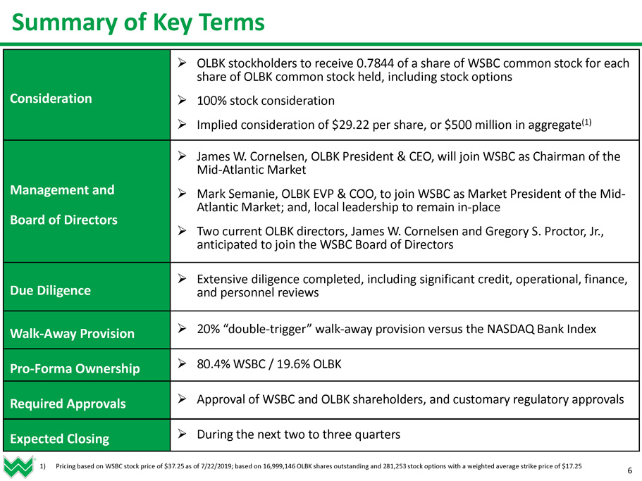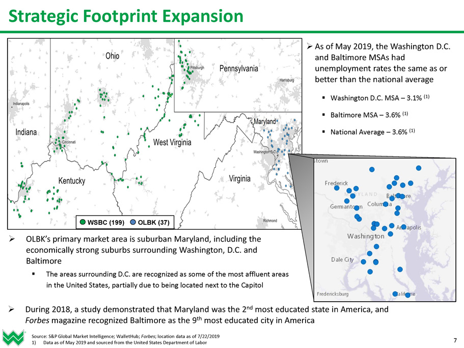 Summary of Key Terms 6 Consideration » OLBK stockholders to receive 0.7844 of a share of WSBC common stock for each share of OLBK common stock held, including stock options » 100% stock consideration » Implied consideration of $29.22 per share, or $500 million in aggregate (1) Management and Board of Directors » James W. Cornelsen, OLBK President & CEO, will join WSBC as Chairman of the Mid - Atlantic Market » Mark Semanie, OLBK EVP & COO, to join WSBC as Market President of the Mid - Atlantic Market; and, local leadership to remain in - place » Two current OLBK directors, James W. Cornelsen and Gregory S. Proctor, Jr., anticipated to join the WSBC Board of Directors Due Diligence » Extensive diligence completed, including significant credit, operational, finance, and personnel reviews Walk - Away Provision » 20% “double - trigger” walk - away provision versus the NASDAQ Bank Index Pro - Forma Ownership » 80.4% WSBC / 19.6% OLBK Required Approvals » Approval of WSBC and OLBK shareholders, and customary regulatory approvals Expected Closing » During the next two to three quarters 1) Pricing based on WSBC stock price of $37.25 as of 7/22/2019; based on 16,999,146 OLBK shares outstanding and 281,253 stock op tio ns with a weighted average strike price of $17.25