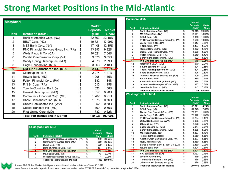 Strategic Footprint Expansion 7 Source: S&P Global Market Intelligence; WalletHub; Forbes ; location data as of 7/22/2019 1) Data as of May 2019 and sourced from the United States Department of Labor WSBC (199) OLBK (37) » As of May 2019, the Washington D.C. and Baltimore MSAs had unemployment rates the same as or better than the national average ▪ Washington D.C. MSA – 3.1% (1) ▪ Baltimore MSA – 3.6% (1) ▪ National Average – 3.6% (1) » OLBK’s primary market area is suburban Maryland, including the economically strong suburbs surrounding Washington, D.C. and Baltimore ▪ The areas surrounding D.C. are recognized as some of the most affluent areas in the United States, partially due to being located next to the Capitol » During 2018, a study demonstrated that Maryland was the 2 nd most educated state in America, and Forbes magazine recognized Baltimore as the 9 th most educated city in America