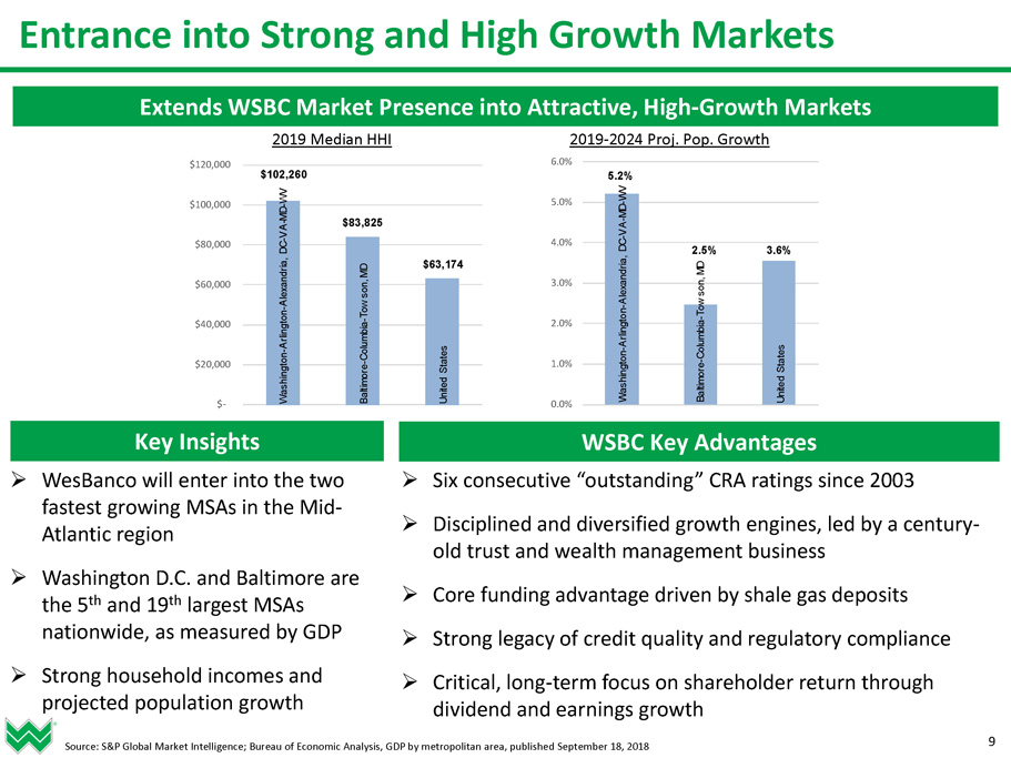 Strong Market Positions in the Mid - Atlantic 8 Source: S&P Global Market Intelligence, deposit market share data as of June 30, 2018 Note: Does not include deposits from closed branches and excludes E*TRADE Financial Corp. from Washington D.C. MSA Lexington Park MSA Rank Institution (State) Market Deposits ($MM) Market Share 1 PNC Financial Services Group Inc. (PA) 440$ 32.52% 2 Community Financial Corp. (MD) 350$ 25.88% 3 BB&T Corp. (NC) 209$ 15.42% 4 Bank of America Corp. (NC) 167$ 12.37% 5 Old Line Bancshares Inc. (MD) 143$ 10.54% 6 M&T Bank Corp. (NY) 43$ 3.21% 7 Woodforest Financial Group Inc. (TX) 1$ 0.06% Total For Institutions In Market 1,353 100.00% Maryland Rank Institution (State) Market Deposits ($MM) Market Share 1 Bank of America Corp. (NC) 32,663$ 23.18% 2 BB&T Corp. (NC) 19,721$ 13.99% 3 M&T Bank Corp. (NY) 17,408$ 12.35% 4 PNC Financial Services Group Inc. (PA) 13,986$ 9.92% 5 Wells Fargo & Co. (CA) 10,621$ 7.54% 6 Capital One Financial Corp. (VA) 9,376$ 6.65% 7 Sandy Spring Bancorp Inc. (MD) 4,076$ 2.89% 8 Eagle Bancorp Inc. (MD) 3,066$ 2.18% 9 Old Line Bancshares Inc. (MD) 2,143$ 1.52% 10 Citigroup Inc. (NY) 2,074$ 1.47% 11 Revere Bank (MD) 1,908$ 1.35% 12 Fulton Financial Corp. (PA) 1,882$ 1.34% 13 F.N.B. Corp. (PA) 1,615$ 1.15% 14 Toronto-Dominion Bank (-) 1,523$ 1.08% 15 Howard Bancorp Inc. (MD) 1,352$ 0.96% 16 Community Financial Corp. (MD) 1,282$ 0.91% 17 Shore Bancshares Inc. (MD) 1,075$ 0.76% 18 United Bankshares Inc. (WV) 952$ 0.68% 19 Capital Bancorp Inc. (MD) 769$ 0.55% 20 First United Corp. (MD) 732$ 0.52% Total For Institutions In Market 140,933 100.00% Baltimore MSA Rank Institution (State) Market Deposits ($MM) Market Share 1 Bank of America Corp. (NC) 21,315$ 29.91% 2 M&T Bank Corp. (NY) 13,521$ 18.97% 3 BB&T Corp. (NC) 8,060$ 11.31% 4 PNC Financial Services Group Inc. (PA) 7,563$ 10.61% 5 Wells Fargo & Co. (CA) 7,017$ 9.85% 6 F.N.B. Corp. (PA) 1,407$ 1.97% 7 Howard Bancorp Inc. (MD) 1,252$ 1.76% 8 Capital One Financial Corp. (VA) 1,068$ 1.50% 9 Fulton Financial Corp. (PA) 1,019$ 1.43% 10 Sandy Spring Bancorp Inc. (MD) 992$ 1.39% 11 Old Line Bancshares Inc. (MD) 679$ 0.95% 12 Rosedale FS&LA. (MD) 670$ 0.94% 13 Severn Bancorp Inc. (MD) 624$ 0.88% 14 Capital Funding Bancorp Inc. (MD) 624$ 0.88% 15 Shore Bancshares Inc. (MD) 426$ 0.60% 16 Orrstown Financial Services Inc. (PA) 409$ 0.57% 17 Revere Bank (MD) 385$ 0.54% 18 Arundel Federal Savings Bank (MD) 368$ 0.52% 19 Queenstown Bancorp of MD Inc. (MD) 367$ 0.51% 20 Glen Burnie Bancorp (MD) 342$ 0.48% Total For Institutions In Market 71,276 100.00% Washington D.C. MSA Rank Institution (State) Market Deposits ($MM) Market Share 1 Bank of America Corp. (NC) 35,611$ 14.24% 2 BB&T Corp. (NC) 31,648$ 12.66% 3 Capital One Financial Corp. (VA) 29,891$ 11.95% 4 Wells Fargo & Co. (CA) 28,942$ 11.57% 5 PNC Financial Services Group Inc. (PA) 13,704$ 5.48% 6 United Bankshares Inc. (WV) 8,095$ 3.24% 7 Citigroup Inc. (NY) 7,188$ 2.87% 8 Eagle Bancorp Inc. (MD) 6,344$ 2.54% 9 Sandy Spring Bancorp Inc. (MD) 4,865$ 1.95% 10 M&T Bank Corp. (NY) 4,337$ 1.73% 11 Toronto-Dominion Bank 3,950$ 1.58% 12 Atlantic Union Bankshares Corp. (VA) 3,877$ 1.55% 13 HSBC Holdings PLC 3,460$ 1.38% 14 Burke & Herbert Bank & Trust Co. (VA) 2,330$ 0.93% 15 Revere Bank (MD) 1,524$ 0.61% 16 Old Line Bancshares Inc. (MD) 1,321$ 0.53% 17 FVCBankcorp Inc. (VA) 1,133$ 0.45% 18 Workers United (PA) 979$ 0.39% 19 Community Financial Corp. (MD) 976$ 0.39% 20 John Marshall Bancorp Inc. (VA) 976$ 0.39% Total For Institutions In Market 250,079 100.00% `