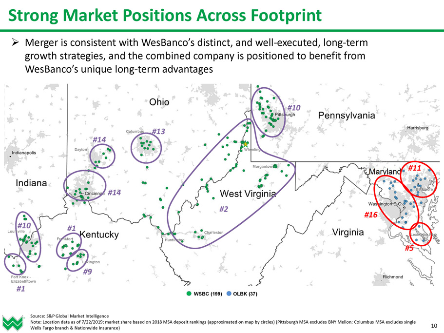 Entrance into Strong and High Growth Markets 9 Extends WSBC Market Presence into Attractive, High - Growth Markets S ource: S&P Global Market Intelligence; Bureau of Economic Analysis, GDP by metropolitan area, published September 18, 2018 » WesBanco will enter into the two fastest growing MSAs in the Mid - Atlantic region » Washington D.C. and Baltimore are the 5 th and 19 th largest MSAs nationwide, as measured by GDP » Strong household incomes and projected population growth 2019 Median HHI 2019 - 2024 Proj. Pop. Growth Key Insights WSBC Key Advantages $- $20,000 $40,000 $60,000 $80,000 $100,000 $120,000 Washington - Arlington - Alexandria , DC - VA - MD - WV Baltimore - Columbia - Towson, MD United States $102,260 $83,825 $63,174 0.0% 1.0% 2.0% 3.0% 4.0% 5.0% 6.0% Washington - Arlington - Alexandria , DC - VA - MD - WV Baltimore - Columbia - Towson, MD United States 5.2% 2.5% 3.6% » Six consecutive “outstanding” CRA ratings since 2003 » Disciplined and diversified growth engines, led by a c entury - old trust and wealth management business » Core funding advantage driven by shale gas deposits » Strong legacy of credit quality and regulatory compliance » Critical , long - term focus on shareholder return through dividend and earnings growth