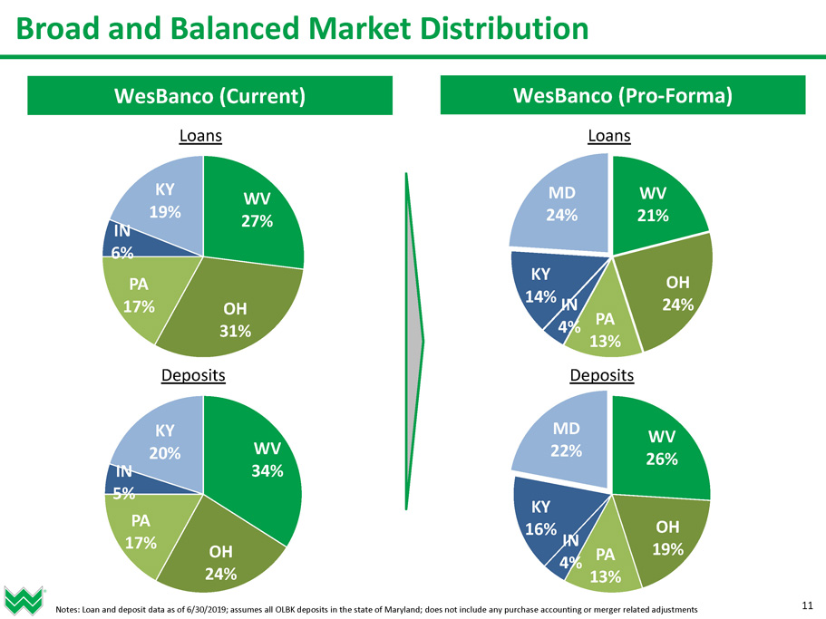 10 Strong Market Positions Across Footprint Source: S&P Global Market Intelligence Note: L ocation data as of 7/22/2019; market share based on 2018 MSA deposit rankings (approximated on map by circles) (Pittsburgh MS A e xcludes BNY Mellon; Columbus MSA excludes single Wells Fargo branch & Nationwide Insurance) #9 Wheeling #1 WSBC (199) OLBK (37) #14 #13 #14 #1 #10 #10 #2 #11 #16 # 5 Fort Knox - Elizabethtown » Merger is consistent with WesBanco’s distinct, and well - executed, long - term growth strategies, and the combined company is positioned to benefit from WesBanco’s unique long - term advantages Louisville Lexington Frankfort Dayton Columbus Morgantown Charleston Huntington Baltimore Lexington Park