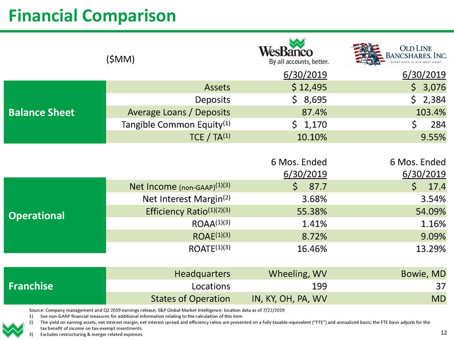 11 Broad and Balanced Market Distribution Notes: L oan and deposit data as of 6/30/2019; assumes all OLBK deposits in the state of Maryland; d oes not include any purchase accounting or merger related adjustments WesBanco (Current) WesBanco (Pro - Forma) WV 27% OH 31% PA 17% IN 6% KY 19% Loans WV 34% OH 24% PA 17% IN 5% KY 20% Deposits WV 21% OH 24% PA 13% IN 4% KY 14% MD 24% Loans WV 26% OH 19% PA 13% IN 4% KY 16% MD 22% Deposits