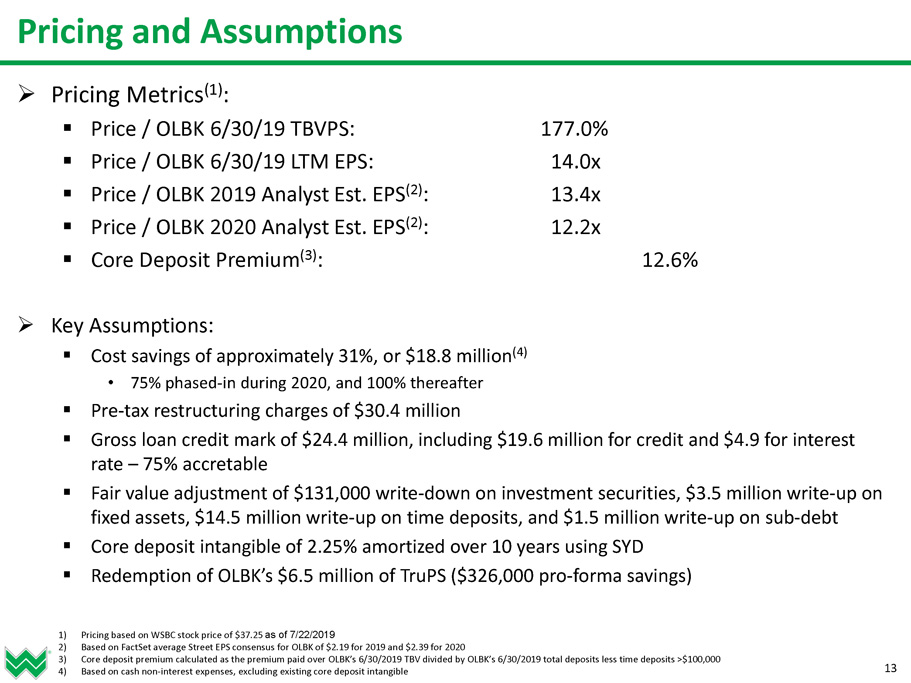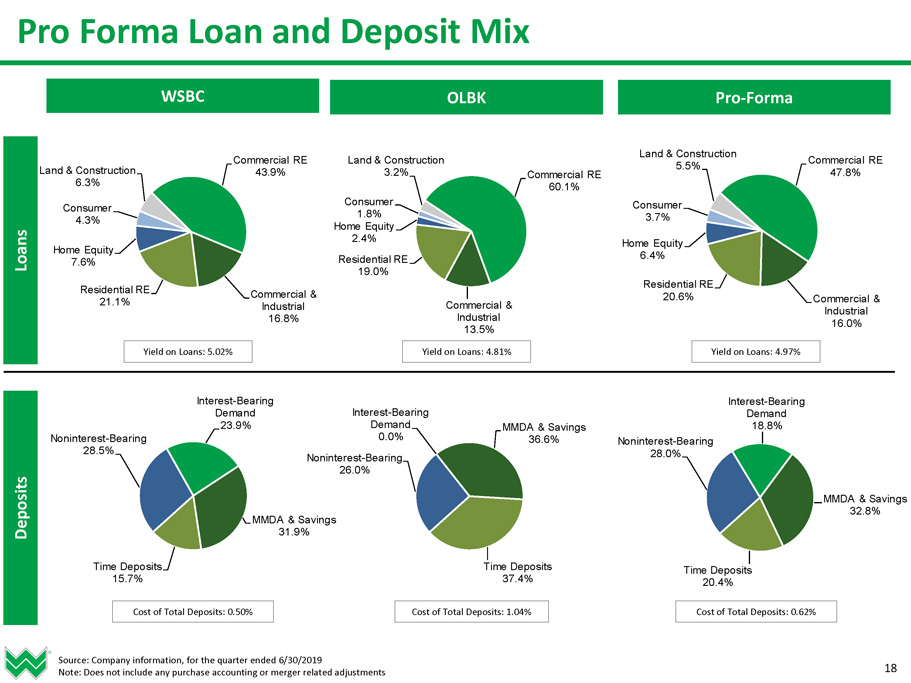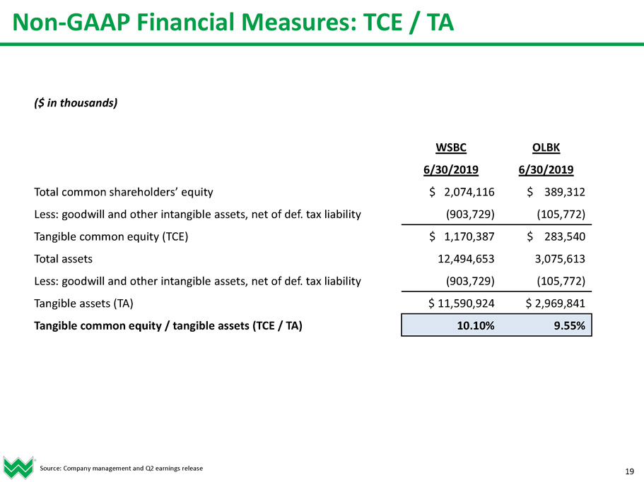 Noninterest - Bearing 28.0% Interest - Bearing Demand 18.8% MMDA & Savings 32.8% Time Deposits 20.4% Noninterest - Bearing 28.5% Interest - Bearing Demand 23.9% MMDA & Savings 31.9% Time Deposits 15.7% Land & Construction 5.5% Commercial RE 47.8% Commercial & Industrial 16.0% Residential RE 20.6% Home Equity 6.4% Consumer 3.7% Land & Construction 6.3% Commercial RE 43.9% Commercial & Industrial 16.8% Residential RE 21.1% Home Equity 7.6% Consumer 4.3% Noninterest - Bearing 26.0% Interest - Bearing Demand 0.0% MMDA & Savings 36.6% Time Deposits 37.4% Land & Construction 3.2% Commercial RE 60.1% Commercial & Industrial 13.5% Residential RE 19.0% Home Equity 2.4% Consumer 1.8% Pro Forma Loan and Deposit Mix 18 WSBC Pro - Forma OLBK Loans Deposits Cost of Total Deposits: 0.50% Cost of Total Deposits: 1.04% Cost of Total Deposits: 0.62% Yield on Loans: 5.02% Yield on Loans: 4.81% Yield on Loans: 4.97% S ource: Company information, for the quarter ended 6/30/2019 Note: Does not include any purchase accounting or merger related adjustments