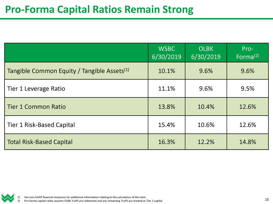 Attractive Pricing Compared to Relevant Deals 14 Deal Metrics Deal Value ($MM) $ 500 $ 206 $ 146 Price / TBVPS 177.0% 202.6% 194.2% Price / LTM EPS 14.0x 22.3x 22.3x Target Financials Total Assets ($MM) $ 3,076 $ 1,322 $ 904 ROAA (1) 1.20% 0.95% 0.82% ROAE (1) 9.44% 8.07% 7.04% Peer Median Source: S&P Global Market Intelligence, pricing based on WSBC stock price of $37.25 as of 7/22/2019 1) ROAA and ROAE shown on an LTM basis for the comparative peer group 2) Select banks and thrifts headquartered nationwide announced since 6/30/2018 where the target’s assets were greater than $500 mil lion and 100% stock consideration 3) Select banks and thrifts headquartered in MD, PA , VA, and WV announced since 1/1/2017 where the target’s assets were greater than $500 million Regional (3 ) Nationwide (2 )