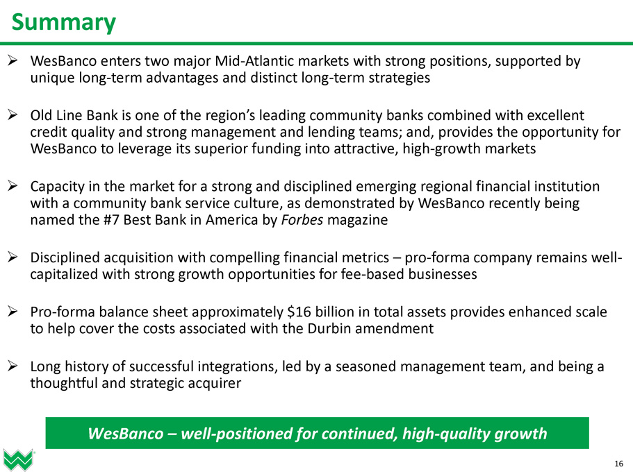 Pro - Forma Capital Ratios Remain Strong 15 WSBC 6/30/2019 OLBK 6/30/2019 Pro - Forma (2) Tangible Common Equity / Tangible Assets (1) 10.1% 9.6% 9.6% Tier 1 Leverage Ratio 11.1% 9.6% 9.5% Tier 1 Common Ratio 13.8% 10.4% 12.6% Tier 1 Risk - Based Capital 15.4% 10.6% 12.6% Total Risk - Based Capital 16.3% 12.2% 14.8% 1) See non - GAAP financial measures for additional information relating to the calculation of this item 2) Pro - forma capital ratios assume OLBK TruPS are redeemed and any remaining TruPS are treated as Tier 2 capital