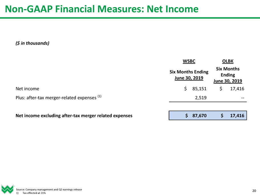 Non - GAAP Financial Measures: TCE / TA 19 Source : Company management and Q2 earnings release ($ in thousands) WSBC OLBK 6/30/2019 6/30/2019 Total common shareholders’ equity $ 2,074,116 $ 389,312 Less: goodwill and other intangible assets, net of def. tax liability (903,729) (105,772) Tangible common equity (TCE) $ 1,170,387 $ 283,540 Total assets 12,494,653 3,075,613 Less: goodwill and other intangible assets, net of def. tax liability (903,729) (105,772) Tangible assets (TA) $ 11,590,924 $ 2,969,841 Tangible common equity / tangible assets (TCE / TA) 10.10% 9.55%