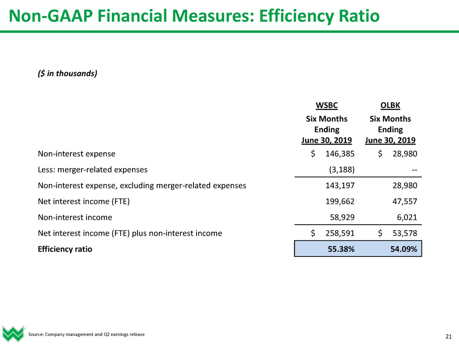 Non - GAAP Financial Measures: Net Income 20 Source : Company management and Q2 earnings release 1) Tax effected at 21% ($ in thousands) WSBC OLBK Six Months Ending June 30, 2019 Six Months Ending June 30, 2019 Net income $ 85,151 $ 17,416 Plus: after - tax merger - related expenses (1) 2,519 -- Net income excluding after - tax merger related expenses $ 87,670 $ 17,416