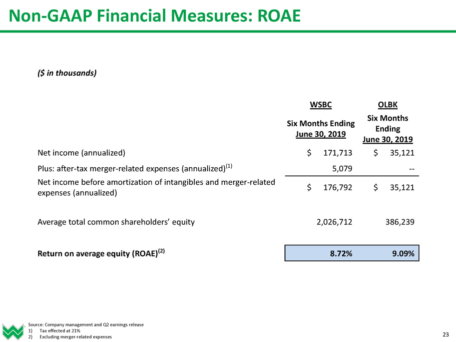 Non - GAAP Financial Measures: ROAA 22 Source : Company management and Q2 earnings release 1) Tax effected at 21% ($ in thousands) WSBC OLBK Six Months Ending June 30, 2019 Six Months Ending June 30, 2019 Net income (annualized) $ 171,713 $ 35,121 Plus: after - tax merger - related expenses (annualized) (1) 5,079 -- Net income excluding after - tax merger related expenses ( annualized) $ 176,792 $ 35,121 Average assets $ 12,499,928 $ 3 ,021,510 Return on average assets (ROAA) 1.41% 1.16%