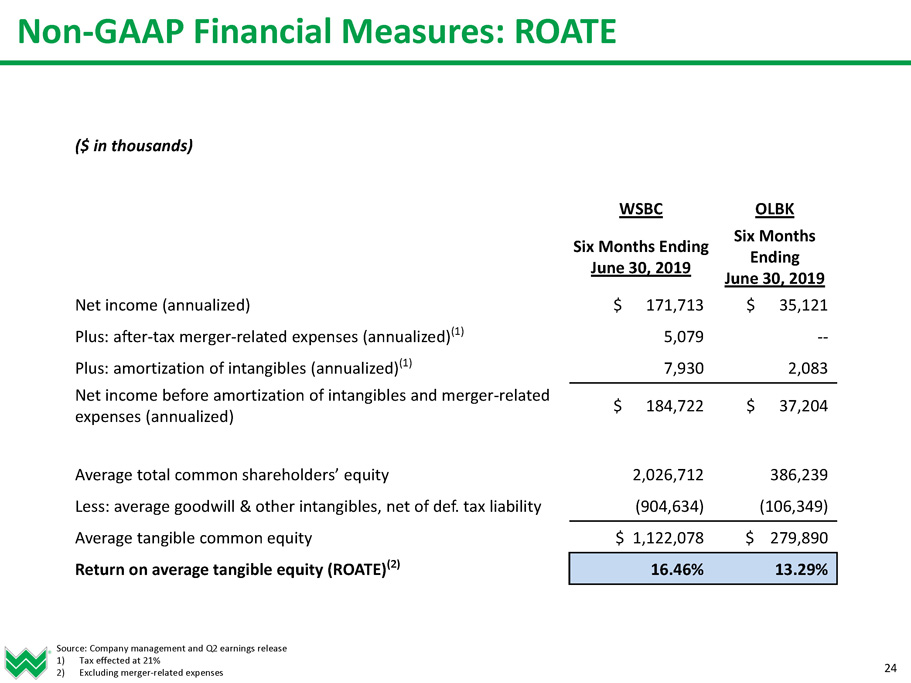 Non - GAAP Financial Measures: ROAE 23 Source : Company management and Q2 earnings release 1) Tax effected at 21% 2) Excluding merger - related expenses ($ in thousands) WSBC OLBK Six Months Ending June 30, 2019 Six Months Ending June 30, 2019 Net income (annualized) $ 171,713 $ 35,121 Plus: after - tax merger - related expenses (annualized) (1) 5,079 -- Net income before amortization of intangibles and merger - related expenses ( annualized) $ 176,792 $ 35,121 Average total common shareholders ’ equity 2,026,712 386,239 Return on average equity ( ROAE) (2) 8.72% 9.09%