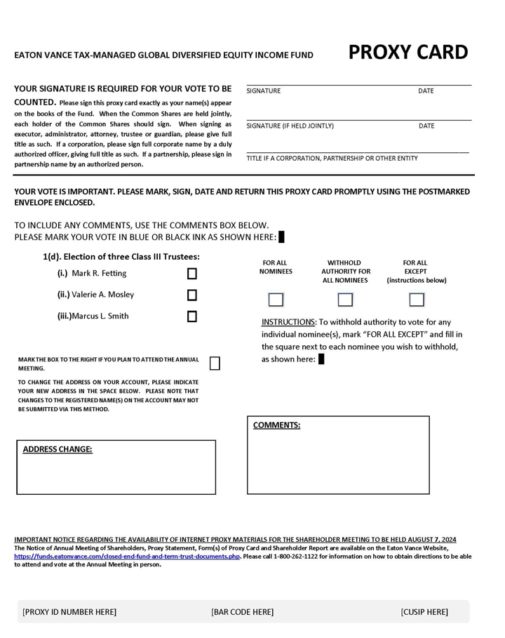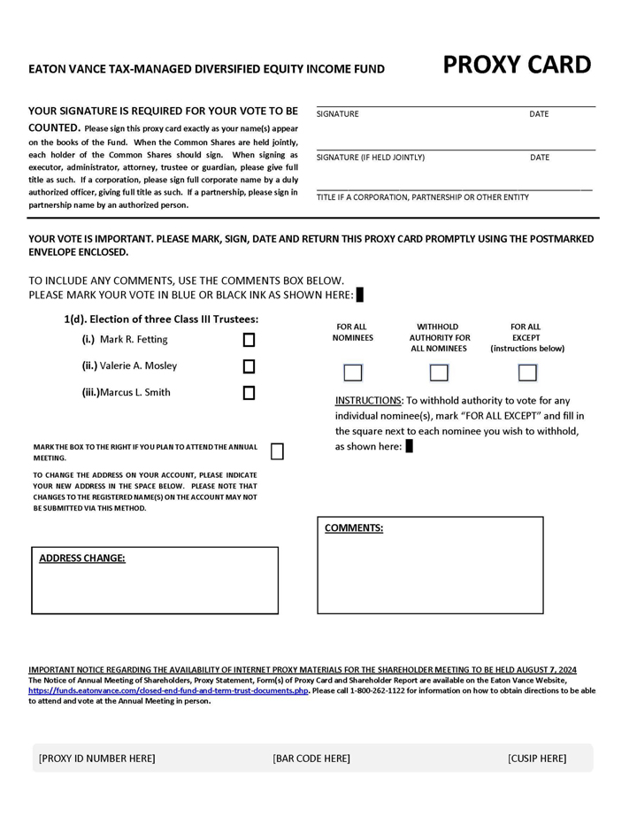 | d. | For Eaton Vance Tax-Managed Diversified Equity Income Fund and Eaton Vance Tax-Managed Global Diversified Equity Income Fund, three Class III Trustees, Mark R. Fetting, Valerie A. Mosley and Marcus L. Smith, to be elected by the shareholders of each Fund’s Common Shares. | |||