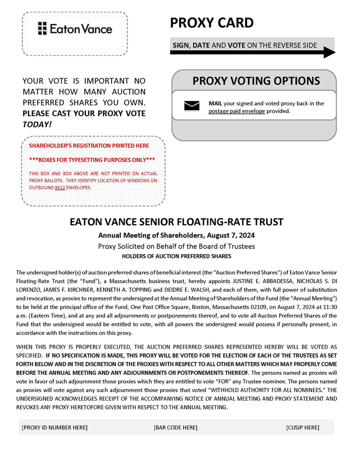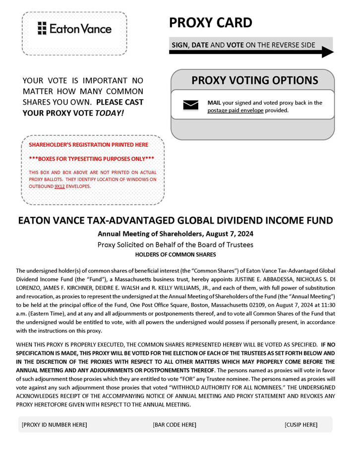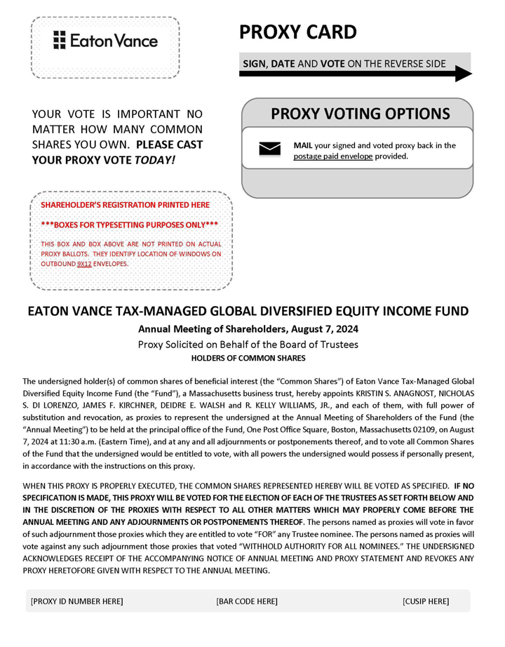 This proxy statement is furnished in connection with the solicitation of proxies by the Board of Trustees of Eaton Vance Senior Floating-Rate Trust (the “Senior Floating-Rate Trust”), Eaton Vance Tax-Advantaged Dividend Income Fund (the “Tax-Advantaged Dividend Income Fund”), Eaton Vance Tax-Advantaged Global Dividend Income Fund (the “Tax-Advantaged Global Dividend Income Fund”), Eaton Vance Tax-Managed Diversified Equity Income Fund (the “Tax-Managed Diversified Equity Income Fund”) and Eaton Vance Tax-Managed Global Diversified Equity Income Fund (the “Tax-Managed Global Diversified Equity Income Fund”) (each, a “Fund” and collectively, the “Funds”). The proxies will be voted at the Annual Meeting of Shareholders of each Fund and at any adjournments or postponements thereof (the “Annual Meeting”). The Annual Meeting will be held on Wednesday, August 7, 2024 at 11:30 a.m. (Eastern Time) at the principal office of each Fund, One Post Office Square, Boston, Massachusetts 02109, as discussed further herein. The Annual Meeting will be held for the purposes set forth in the accompanying notice. This proxy statement and the enclosed proxy cards are first being sent or given to shareholders on or about June 24, 2024.