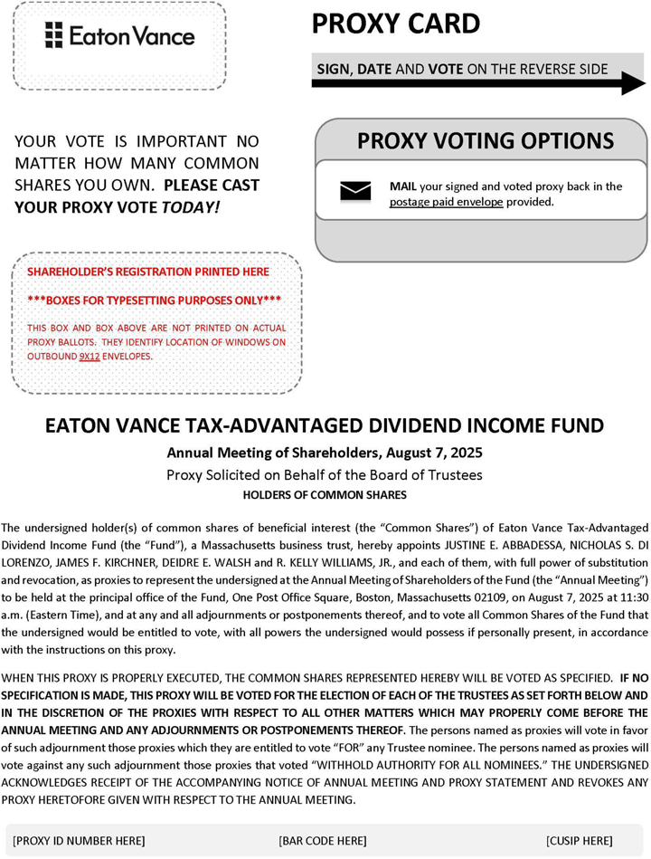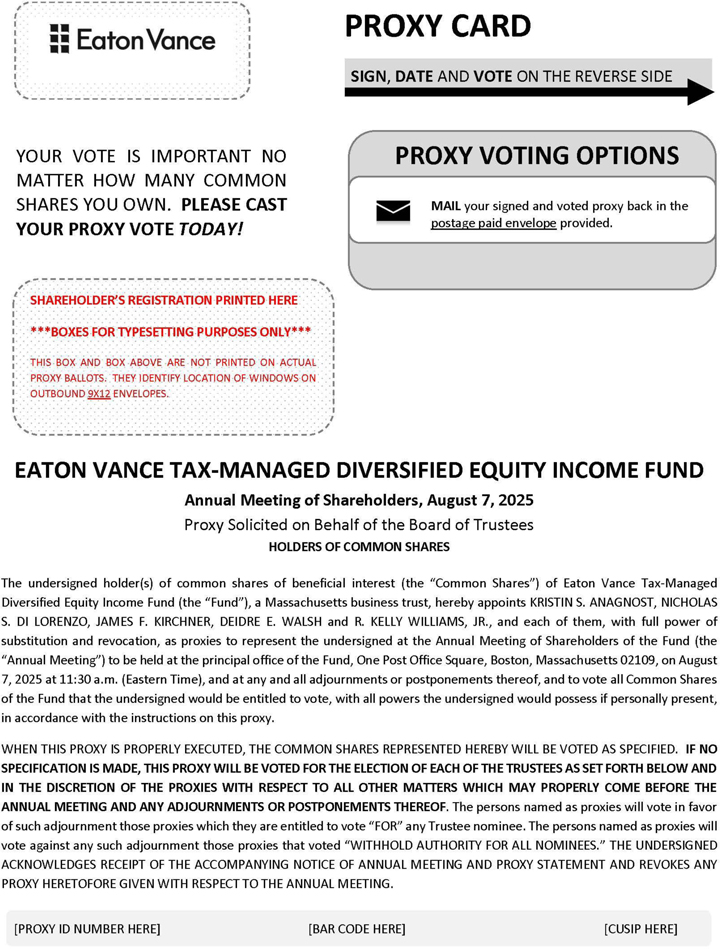 This proxy statement is furnished in connection with the solicitation of proxies by the Board of Trustees of Eaton Vance Senior Floating-Rate Trust (the “Senior Floating-Rate Trust”), Eaton Vance Tax-Advantaged Dividend Income Fund (the “Tax-Advantaged Dividend Income Fund”), Eaton Vance Tax-Advantaged Global Dividend Income Fund (the “Tax-Advantaged Global Dividend Income Fund”), Eaton Vance Tax-Managed Diversified Equity Income Fund (the “Tax-Managed Diversified Equity Income Fund”) and Eaton Vance Tax-Managed Global Diversified Equity Income Fund (the “Tax-Managed Global Diversified Equity Income Fund”) (each, a “Fund” and collectively, the “Funds”). The proxies will be voted at the Annual Meeting of Shareholders of each Fund and at any adjournments or postponements thereof (the “Annual Meeting”). The Annual Meeting will be held on Thursday, August 7, 2025 at 11:30 a.m. (Eastern Time) at the principal office of each Fund, One Post Office Square, Boston, Massachusetts 02109, as discussed further herein. The Annual Meeting will be held for the purposes set forth in the accompanying notice. This proxy statement and the enclosed proxy card(s) are first being sent or given to shareholders on or about June 23, 2025.