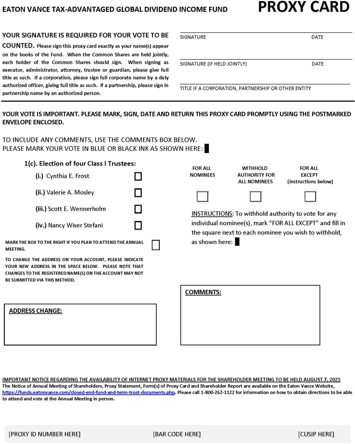 | c. | For Eaton Vance Tax-Advantaged Global Dividend Income Fund, four Class I Trustees, Cynthia E. Frost, Valerie A. Mosley, Scott E. Wennerholm and Nancy Wiser Stefani, to be elected by the shareholders of the Fund’s Common Shares; and | ||