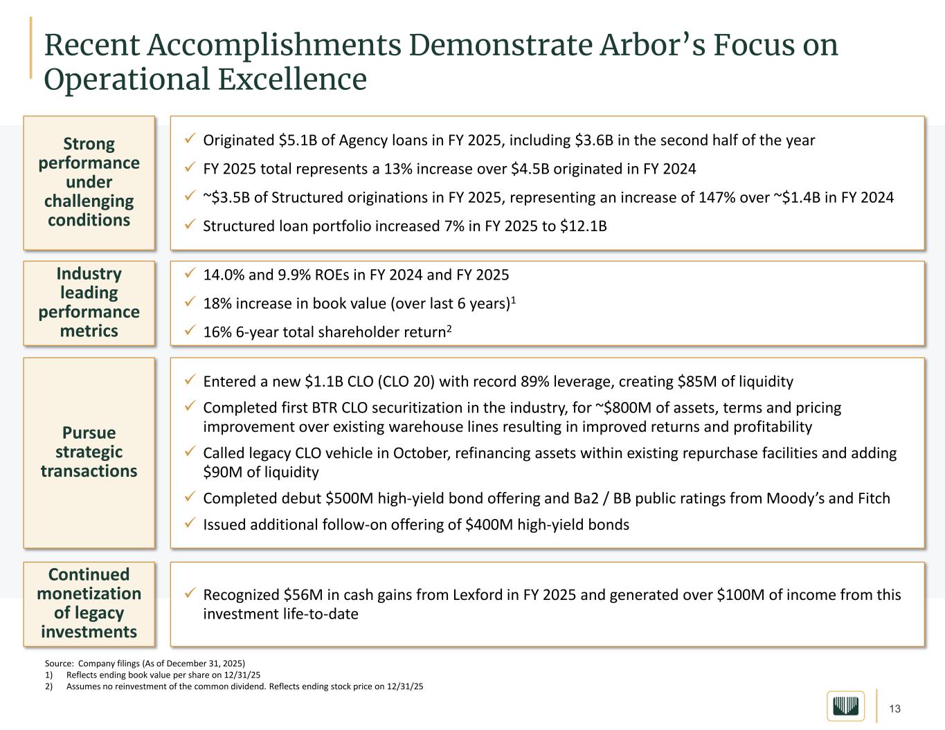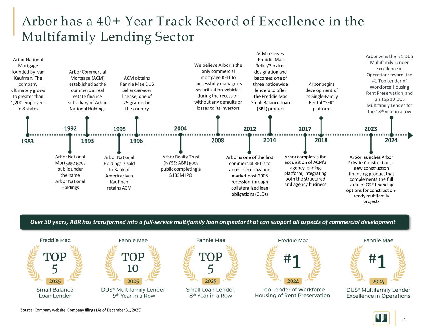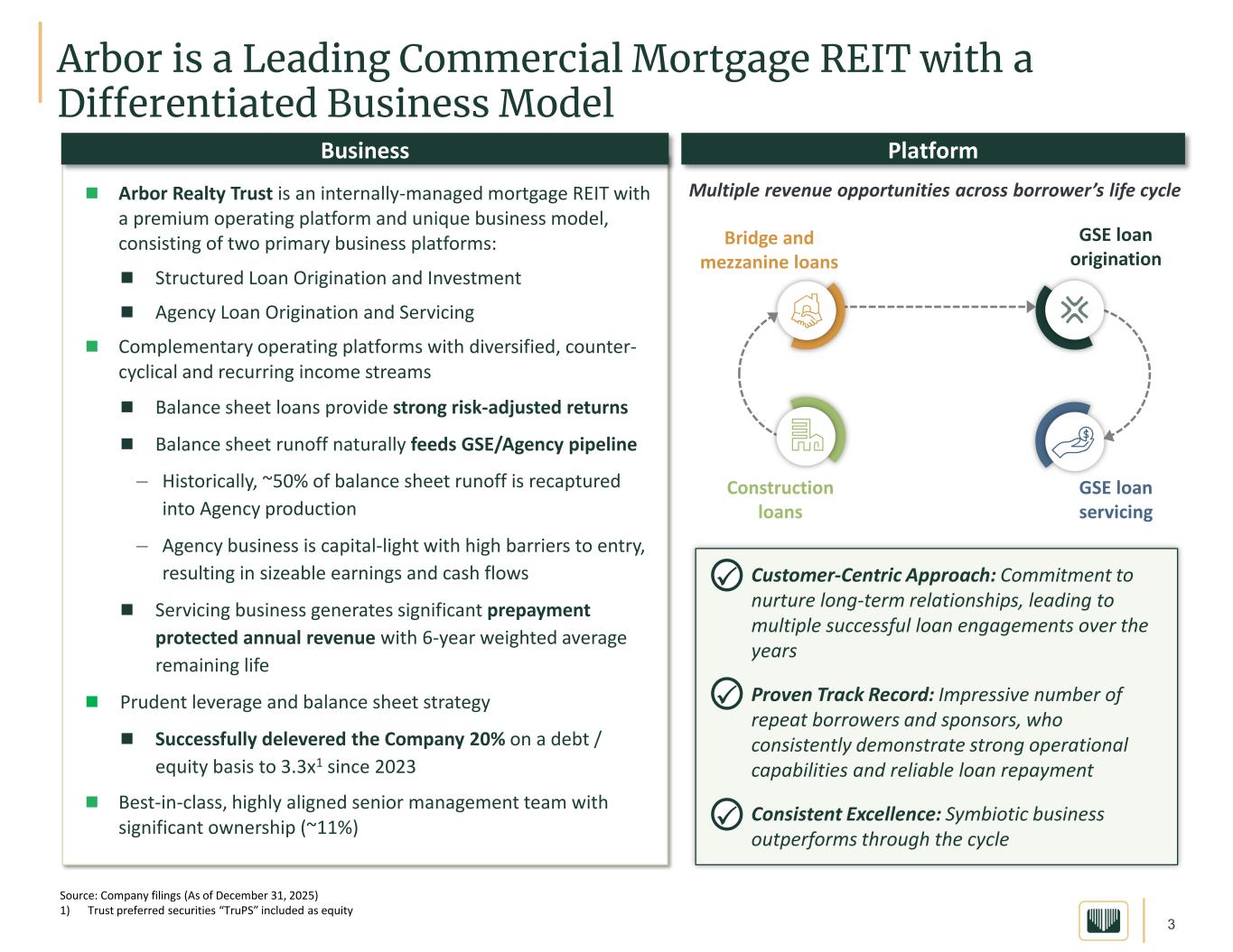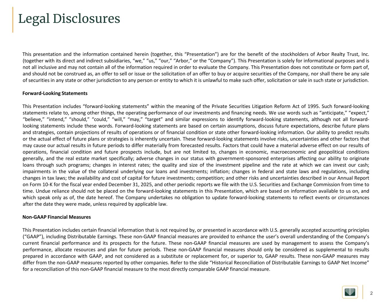 2 Legal Disclosures This presentation and the information contained herein (together, this “Presentation”) are for the benefit of the stockholders of Arbor Realty Trust, Inc. (together with its direct and indirect subsidiaries, “we,” “us,” “our,” “Arbor,” or the “Company”). This Presentation is solely for informational purposes and is not all inclusive and may not contain all of the information required in order to evaluate the Company. This Presentation does not constitute or form part of, and should not be construed as, an offer to sell or issue or the solicitation of an offer to buy or acquire securities of the Company, nor shall there be any sale of securities in any state or other jurisdiction to any person or entity to which it is unlawful to make such offer, solicitation or sale in such state or jurisdiction. Forward-Looking Statements This Presentation includes “forward-looking statements” within the meaning of the Private Securities Litigation Reform Act of 1995. Such forward-looking statements relate to, among other things, the operating performance of our investments and financing needs. We use words such as “anticipate,” “expect,” “believe,” “intend,” “should,” “could,” “will,” “may,” “target” and similar expressions to identify forward-looking statements, although not all forward- looking statements include these words. Forward-looking statements are based on certain assumptions, discuss future expectations, describe future plans and strategies, contain projections of results of operations or of financial condition or state other forward-looking information. Our ability to predict results or the actual effect of future plans or strategies is inherently uncertain. These forward-looking statements involve risks, uncertainties and other factors that may cause our actual results in future periods to differ materially from forecasted results. Factors that could have a material adverse effect on our results of operations, financial condition and future prospects include, but are not limited to, changes in economic, macroeconomic and geopolitical conditions generally, and the real estate market specifically; adverse changes in our status with government-sponsored enterprises affecting our ability to originate loans through such programs; changes in interest rates; the quality and size of the investment pipeline and the rate at which we can invest our cash; impairments in the value of the collateral underlying our loans and investments; inflation; changes in federal and state laws and regulations, including changes in tax laws; the availability and cost of capital for future investments; competition; and other risks and uncertainties described in our Annual Report on Form 10-K for the fiscal year ended December 31, 2025, and other periodic reports we file with the U.S. Securities and Exchange Commission from time to time. Undue reliance should not be placed on the forward-looking statements in this Presentation, which are based on information available to us on, and which speak only as of, the date hereof. The Company undertakes no obligation to update forward-looking statements to reflect events or circumstances after the date they were made, unless required by applicable law. Non-GAAP Financial Measures This Presentation includes certain financial information that is not required by, or presented in accordance with U.S. generally accepted accounting principles (“GAAP”), including Distributable Earnings. These non-GAAP financial measures are provided to enhance the user’s overall understanding of the Company’s current financial performance and its prospects for the future. These non-GAAP financial measures are used by management to assess the Company’s performance, allocate resources and plan for future periods. These non-GAAP financial measures should only be considered as supplemental to results prepared in accordance with GAAP, and not considered as a substitute or replacement for, or superior to, GAAP results. These non-GAAP measures may differ from the non-GAAP measures reported by other companies. Refer to the slide “Historical Reconciliation of Distributable Earnings to GAAP Net Income” for a reconciliation of this non-GAAP financial measure to the most directly comparable GAAP financial measure.