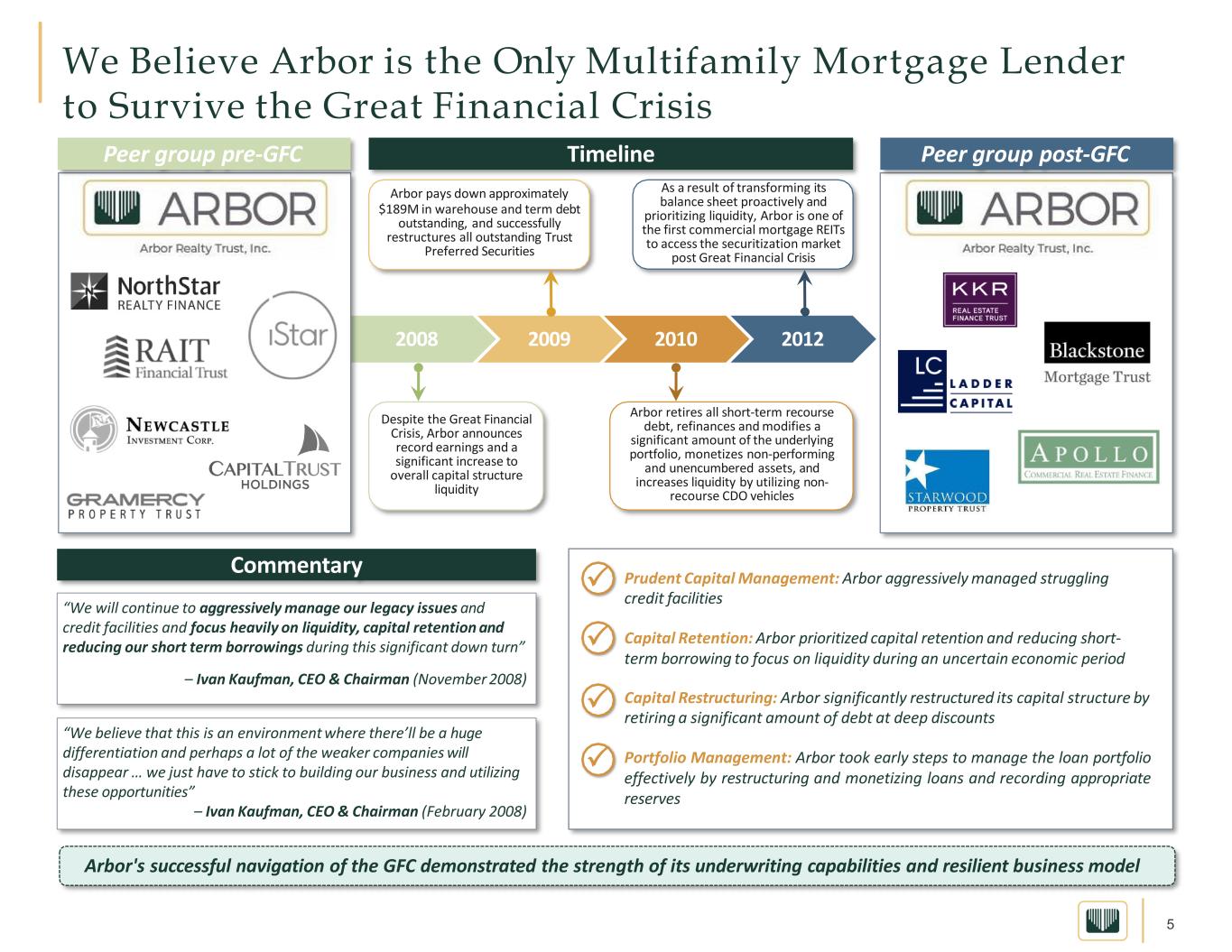 4 Arbor has a 40+ Year Track Record of Excellence in the Multifamily Lending Sector Arbor National Mortgage founded by Ivan Kaufman. The company ultimately grows to greater than 1,200 employees in 8 states 1983 1992 Arbor National Mortgage goes public under the name Arbor National Holdings Arbor Commercial Mortgage (ACM) established as the commercial real estate finance subsidiary of Arbor National Holdings 1993 Arbor Realty Trust (NYSE: ABR) goes public completing a $135M IPO 2004 ACM obtains Fannie Mae DUS Seller/Servicer license, one of 25 granted in the country 1996 Arbor is one of the first commercial REITs to access securitization market post-2008 recession through collateralized loan obligations (CLOs) 2012 ACM receives Freddie Mac Seller/Servicer designation and becomes one of three nationwide lenders to offer the Freddie Mac Small Balance Loan (SBL) product 2014 Arbor completes the acquisition of ACM’s agency lending platform, integrating both the structured and agency business 2017 Arbor begins development of its Single-Family Rental “SFR” platform 2018 Arbor wins the #1 DUS Multifamily Lender Excellence in Operations award, the #1 Top Lender of Workforce Housing Rent Preservation, and is a top 10 DUS Multifamily Lender for the 18th year in a row 2024 Arbor launches Arbor Private Construction, a new construction financing product that complements the full suite of GSE financing options for construction- ready multifamily projects 2023 Over 30 years, ABR has transformed into a full-service multifamily loan originator that can support all aspects of commercial development 1995 Arbor National Holdings is sold to Bank of America; Ivan Kaufman retains ACM We believe Arbor is the only commercial mortgage REIT to successfully manage its securitization vehicles during the recession without any defaults or losses to its investors 2008 Source: Company website, Company filings (As of December 31, 2025)