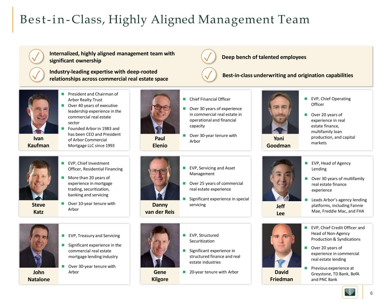 5 2008 We Believe Arbor is the Only Multifamily Mortgage Lender to Survive the Great Financial Crisis 2009 2010 2012 Despite the Great Financial Crisis, Arbor announces record earnings and a significant increase to overall capital structure liquidity Arbor pays down approximately $189M in warehouse and term debt outstanding, and successfully restructures all outstanding Trust Preferred Securities Arbor retires all short-term recourse debt, refinances and modifies a significant amount of the underlying portfolio, monetizes non-performing and unencumbered assets, and increases liquidity by utilizing non- recourse CDO vehicles As a result of transforming its balance sheet proactively and prioritizing liquidity, Arbor is one of the first commercial mortgage REITs to access the securitization market post Great Financial Crisis “We will continue to aggressively manage our legacy issues and credit facilities and focus heavily on liquidity, capital retention and reducing our short term borrowings during this significant down turn” – Ivan Kaufman, CEO & Chairman (November 2008) “We believe that this is an environment where there’ll be a huge differentiation and perhaps a lot of the weaker companies will disappear … we just have to stick to building our business and utilizing these opportunities” – Ivan Kaufman, CEO & Chairman (February 2008) Capital Retention: Arbor prioritized capital retention and reducing short- term borrowing to focus on liquidity during an uncertain economic period Portfolio Management: Arbor took early steps to manage the loan portfolio effectively by restructuring and monetizing loans and recording appropriate reserves Capital Restructuring: Arbor significantly restructured its capital structure by retiring a significant amount of debt at deep discounts Prudent Capital Management: Arbor aggressively managed struggling credit facilities Timeline Commentary Arbor's successful navigation of the GFC demonstrated the strength of its underwriting capabilities and resilient business model Peer group pre-GFC Peer group post-GFC