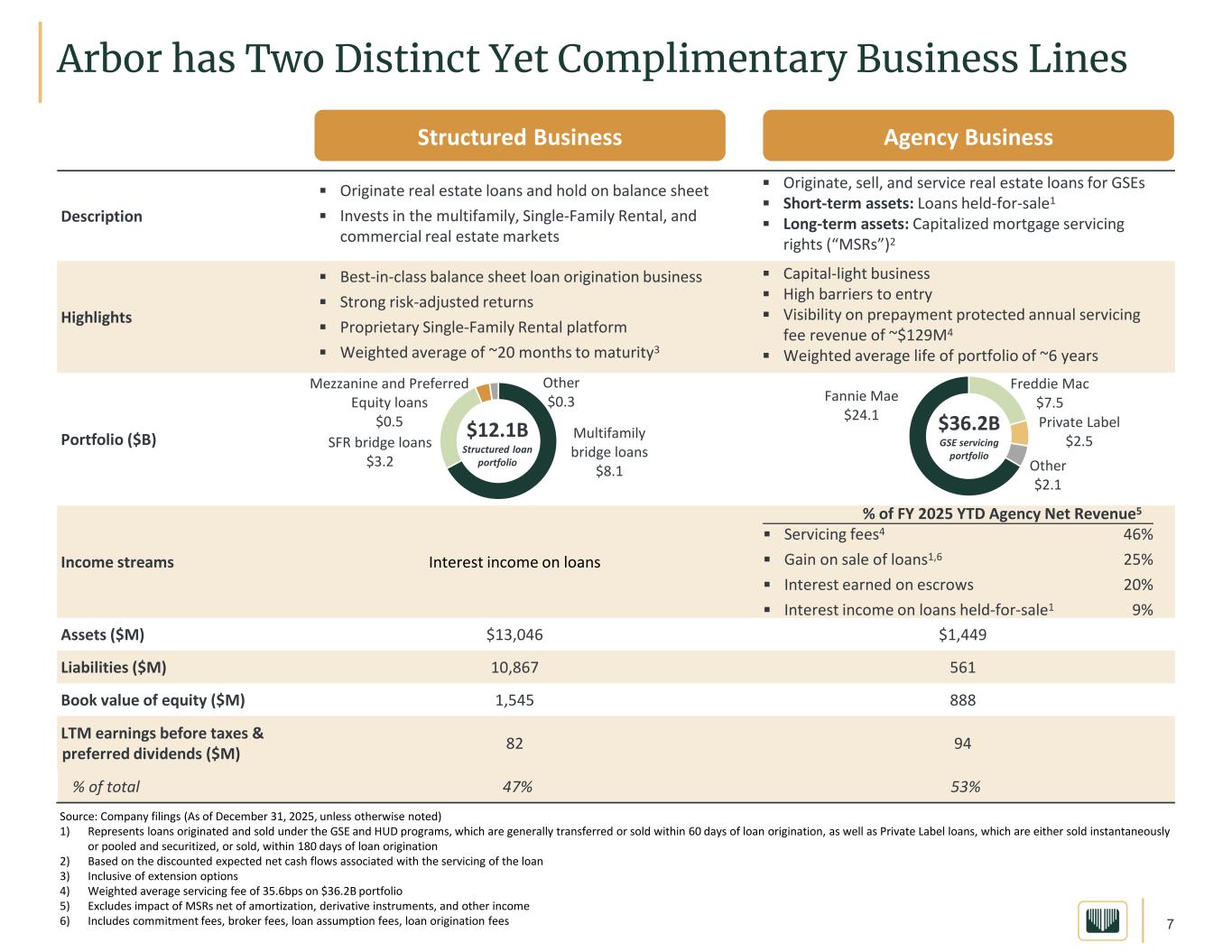 6 Best - i n - Class, Highly Aligned Management Team Internalized, highly aligned management team with significant ownership Industry-leading expertise with deep-rooted relationships across commercial real estate space Deep bench of talented employees Best-in-class underwriting and origination capabilities ✓ ✓ ✓ ✓ President and Chairman of Arbor Realty Trust Over 40 years of executive leadership experience in the commercial real estate sector Founded Arbor in 1983 and has been CEO and President of Arbor Commercial Mortgage LLC since 1993 Ivan Kaufman Chief Financial Officer Over 30 years of experience in commercial real estate in operational and financial capacity Over 30-year tenure with ArborPaul Elenio EVP, Chief Operating Officer Over 20 years of experience in real estate finance, multifamily loan production, and capital markets EVP, Structured Securitization Significant experience in structured finance and real estate industries 20-year tenure with ArborGene Kilgore EVP, Head of Agency Lending Over 30 years of multifamily real estate finance experience Leads Arbor’s agency lending platforms, including Fannie Mae, Freddie Mac, and FHA EVP, Chief Investment Officer, Residential Financing More than 20 years of experience in mortgage trading, securitization, banking and servicing Over 10-year tenure with Arbor Steve Katz EVP, Servicing and Asset Management Over 25 years of commercial real estate experience Significant experience in special servicingDanny van der Reis EVP, Treasury and Servicing Significant experience in the commercial real estate mortgage lending industry Over 30-year tenure with ArborJohn Natalone EVP, Chief Credit Officer and Head of Non-Agency Production & Syndications Over 20 years of experience in commercial real estate lending Previous experience at Greystone, TD Bank, BofA and PNC Bank David Friedman Yoni Goodman Jeff Lee
