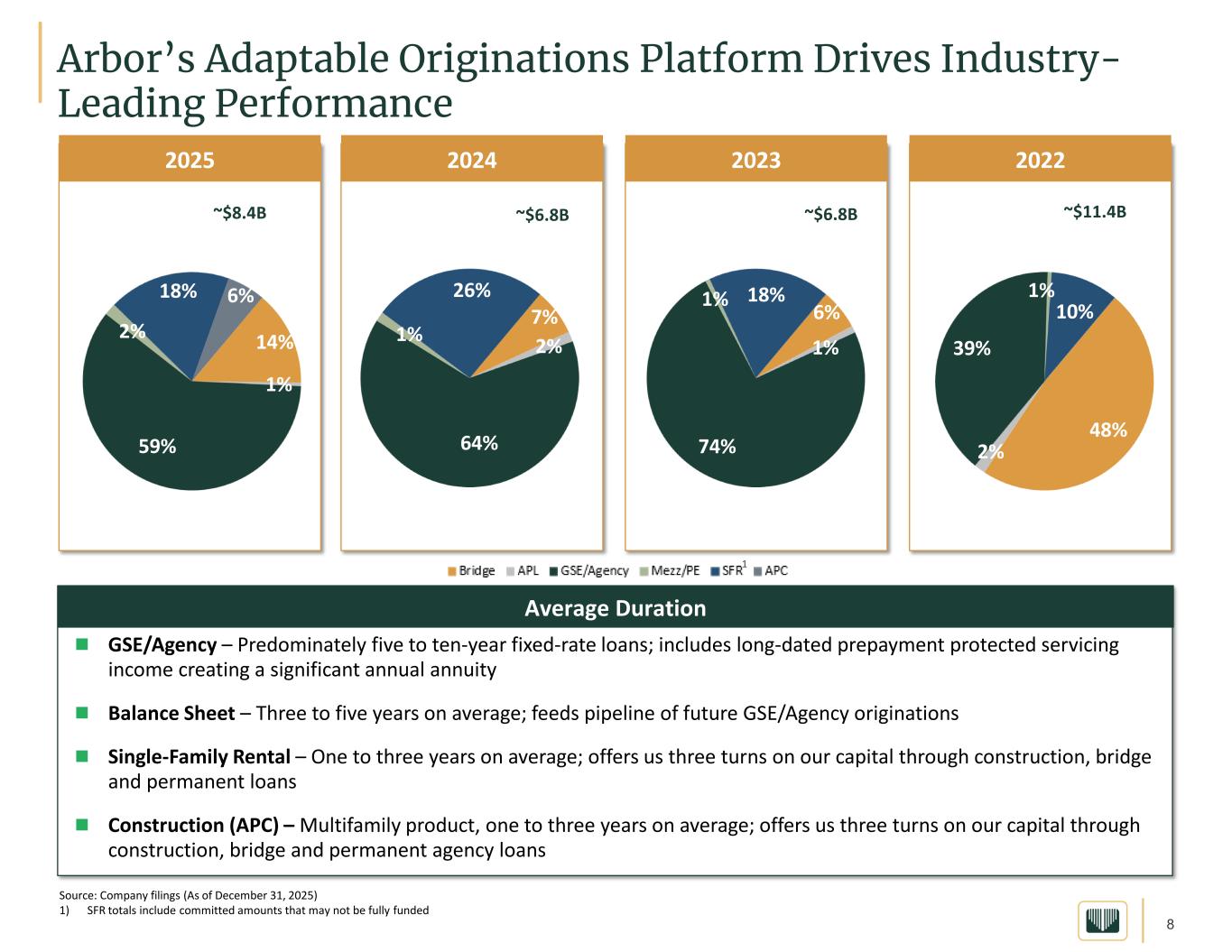 7 Arbor has Two Distinct Yet Complimentary Business Lines Description Originate real estate loans and hold on balance sheet Invests in the multifamily, Single-Family Rental, and commercial real estate markets Originate, sell, and service real estate loans for GSEs Short-term assets: Loans held-for-sale1 Long-term assets: Capitalized mortgage servicing rights (“MSRs”)2 Highlights Best-in-class balance sheet loan origination business Strong risk-adjusted returns Proprietary Single-Family Rental platform Weighted average of ~20 months to maturity3 Capital-light business High barriers to entry Visibility on prepayment protected annual servicing fee revenue of ~$129M4 Weighted average life of portfolio of ~6 years Portfolio ($B) Income streams Interest income on loans Assets ($M) $13,046 $1,449 Liabilities ($M) 10,867 561 Book value of equity ($M) 1,545 888 LTM earnings before taxes & preferred dividends ($M) 82 94 % of total 47% 53% Structured Business Agency Business Multifamily bridge loans $8.1 SFR bridge loans $3.2 Mezzanine and Preferred Equity loans $0.5 Other $0.3 $12.1B Structured loan portfolio Freddie Mac $7.5 Private Label $2.5 Other $2.1 Fannie Mae $24.1 $36.2B GSE servicing portfolio Source: Company filings (As of December 31, 2025, unless otherwise noted) 1) Represents loans originated and sold under the GSE and HUD programs, which are generally transferred or sold within 60 days of loan origination, as well as Private Label loans, which are either sold instantaneously or pooled and securitized, or sold, within 180 days of loan origination 2) Based on the discounted expected net cash flows associated with the servicing of the loan 3) Inclusive of extension options 4) Weighted average servicing fee of 35.6bps on $36.2B portfolio 5) Excludes impact of MSRs net of amortization, derivative instruments, and other income 6) Includes commitment fees, broker fees, loan assumption fees, loan origination fees % of FY 2025 YTD Agency Net Revenue5 Servicing fees4 Gain on sale of loans1,6 Interest earned on escrows Interest income on loans held-for-sale1 46% 25% 20% 9%