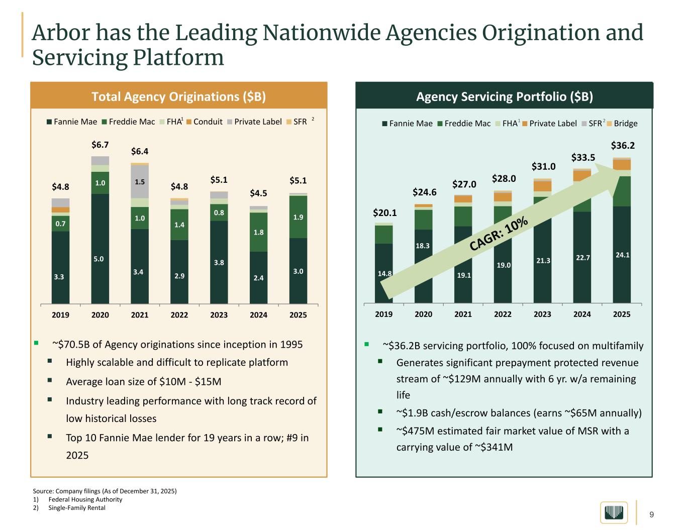8 GSE/Agency – Predominately five to ten-year fixed-rate loans; includes long-dated prepayment protected servicing income creating a significant annual annuity Balance Sheet – Three to five years on average; feeds pipeline of future GSE/Agency originations Single-Family Rental – One to three years on average; offers us three turns on our capital through construction, bridge and permanent loans Construction (APC) – Multifamily product, one to three years on average; offers us three turns on our capital through construction, bridge and permanent agency loans Arbor’s Adaptable Originations Platform Drives Industry- Leading Performance Source: Company filings (As of December 31, 2025) 1) SFR totals include committed amounts that may not be fully funded Average Duration 2022 ~$11.4B 2024 ~$6.8B 2023 ~$6.8B 2025 ~$8.4B 14% 1% 59% 2% 18% 6% 1 7% 2% 64% 1% 26% 6% 1% 74% 1% 18% 48% 2% 39% 1% 10%