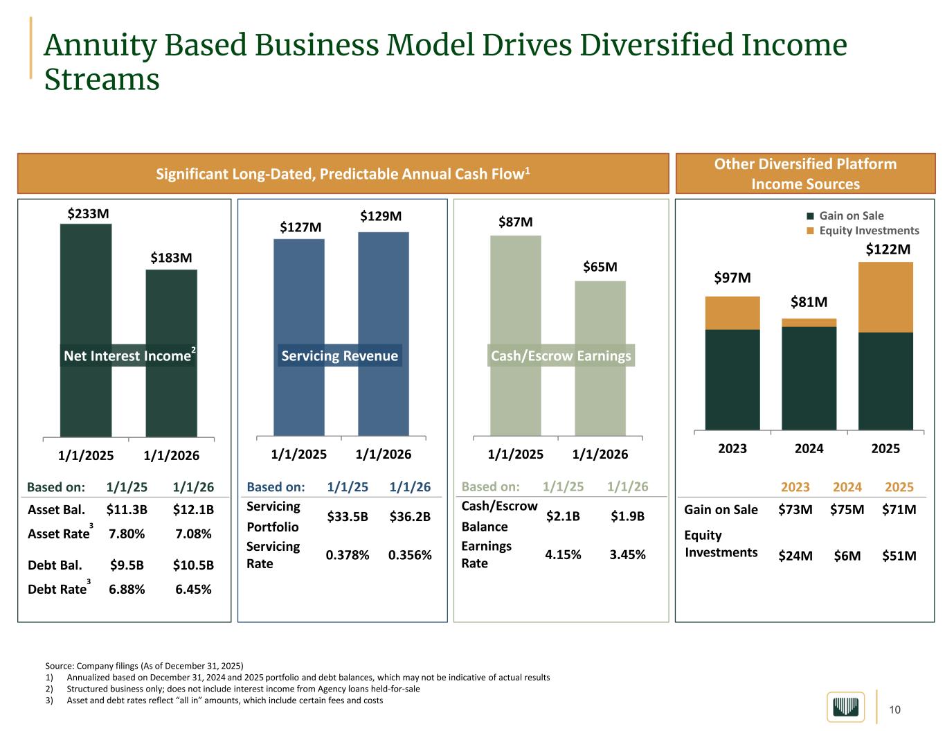 10 Annuity Based Business Model Drives Diversified Income Streams Source: Company filings (As of December 31, 2025) 1) Annualized based on December 31, 2024 and 2025 portfolio and debt balances, which may not be indicative of actual results 2) Structured business only; does not include interest income from Agency loans held-for-sale 3) Asset and debt rates reflect “all in” amounts, which include certain fees and costs 2 3 3 Significant Long-Dated, Predictable Annual Cash Flow1 Other Diversified Platform Income Sources Based on: 1/1/25 1/1/26 Cash/Escrow Balance $2.1B $1.9B Earnings Rate 4.15% 3.45% Based on: 1/1/25 1/1/26 Servicing Portfolio $33.5B $36.2B Servicing Rate 0.378% 0.356% Based on: 1/1/25 1/1/26 Asset Bal. $11.3B $12.1B Asset Rate 7.80% 7.08% Debt Bal. $9.5B $10.5B Debt Rate 6.88% 6.45% 2023 2024 2025 Gain on Sale $73M $75M $71M Equity Investments $24M $6M $51M $127M $129M 1/1/2025 1/1/2026 Servicing Revenue $233M $183M 1/1/2025 1/1/2026 Net Interest Income $97M $81M $122M 2023 2024 2025 Gain on Sale Equity Investments $87M $65M 1/1/2025 1/1/2026 Cash/Escrow Earnings2