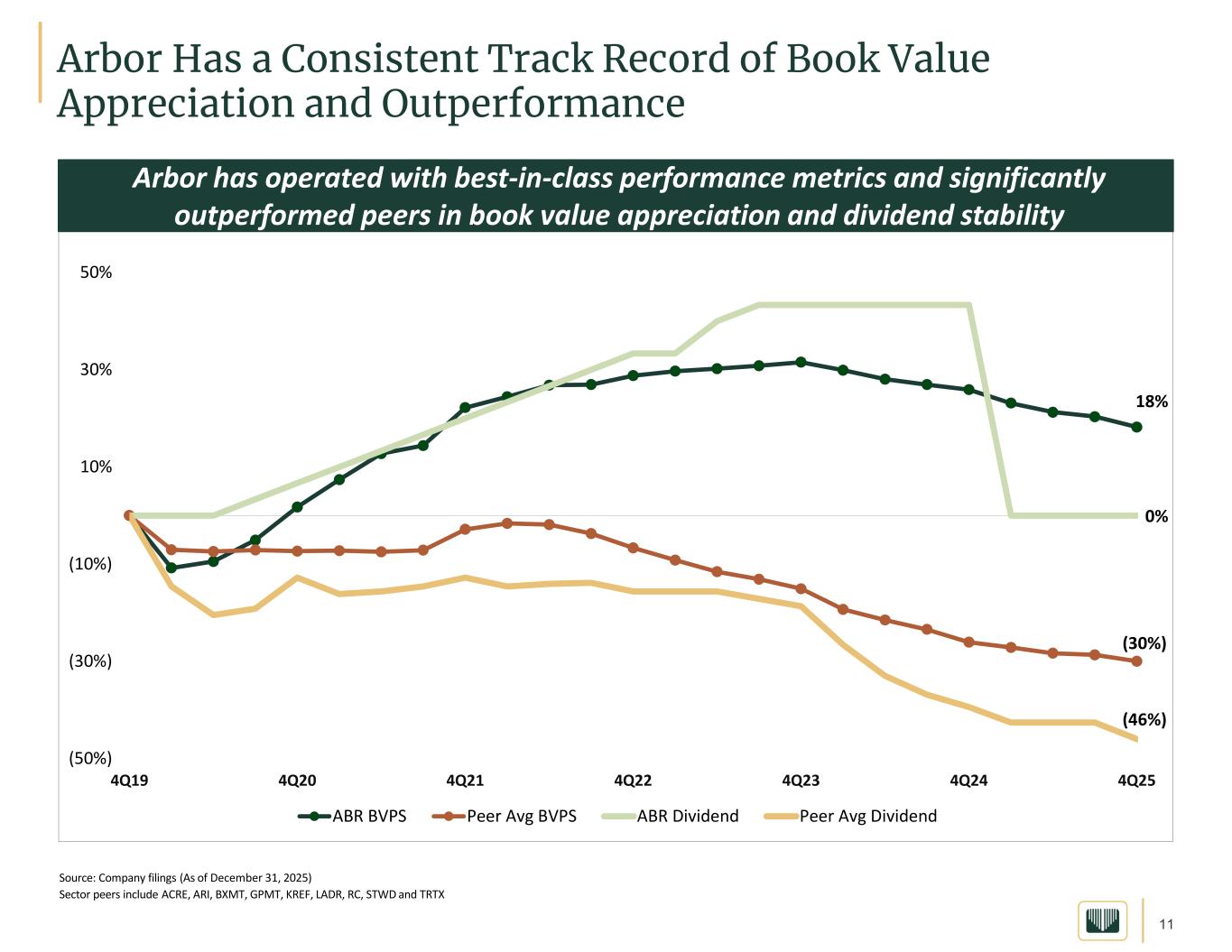 11 Arbor Has a Consistent Track Record of Book Value Appreciation and Outperformance Source: Company filings (As of December 31, 2025) Sector peers include ACRE, ARI, BXMT, GPMT, KREF, LADR, RC, STWD and TRTX 18% (30%) 0% (46%) (50%) (30%) (10%) 10% 30% 50% 4Q19 4Q20 4Q21 4Q22 4Q23 4Q24 4Q25 A ABR BVPS Peer Avg BVPS ABR Dividend Peer Avg Dividend Arbor has operated with best-in-class performance metrics and significantly outperformed peers in book value appreciation and dividend stability