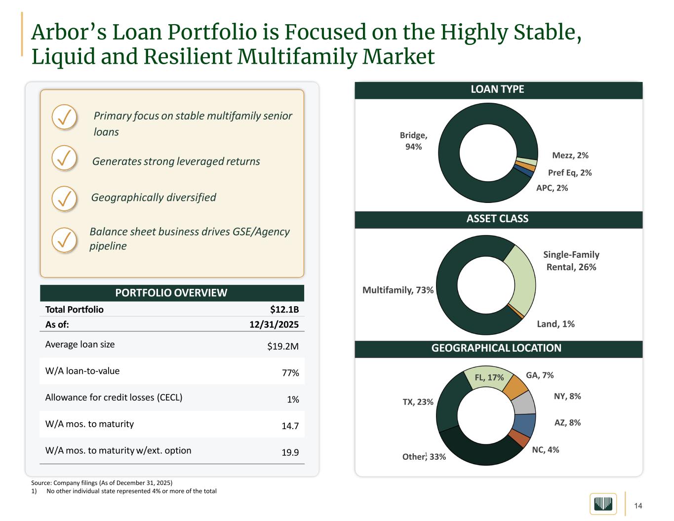 13 Recent Accomplishments Demonstrate Arbor’s Focus on Operational Excellence Continued monetization of legacy investments Recognized $56M in cash gains from Lexford in FY 2025 and generated over $100M of income from this investment life-to-date Pursue strategic transactions Entered a new $1.1B CLO (CLO 20) with record 89% leverage, creating $85M of liquidity Completed first BTR CLO securitization in the industry, for ~$800M of assets, terms and pricing improvement over existing warehouse lines resulting in improved returns and profitability Called legacy CLO vehicle in October, refinancing assets within existing repurchase facilities and adding $90M of liquidity Completed debut $500M high-yield bond offering and Ba2 / BB public ratings from Moody’s and Fitch Issued additional follow-on offering of $400M high-yield bonds Strong performance under challenging conditions Originated $5.1B of Agency loans in FY 2025, including $3.6B in the second half of the year FY 2025 total represents a 13% increase over $4.5B originated in FY 2024 ~$3.5B of Structured originations in FY 2025, representing an increase of 147% over ~$1.4B in FY 2024 Structured loan portfolio increased 7% in FY 2025 to $12.1B Source: Company filings (As of December 31, 2025) 1) Reflects ending book value per share on 12/31/25 2) Assumes no reinvestment of the common dividend. Reflects ending stock price on 12/31/25 Industry leading performance metrics 14.0% and 9.9% ROEs in FY 2024 and FY 2025 18% increase in book value (over last 6 years)1 16% 6-year total shareholder return2