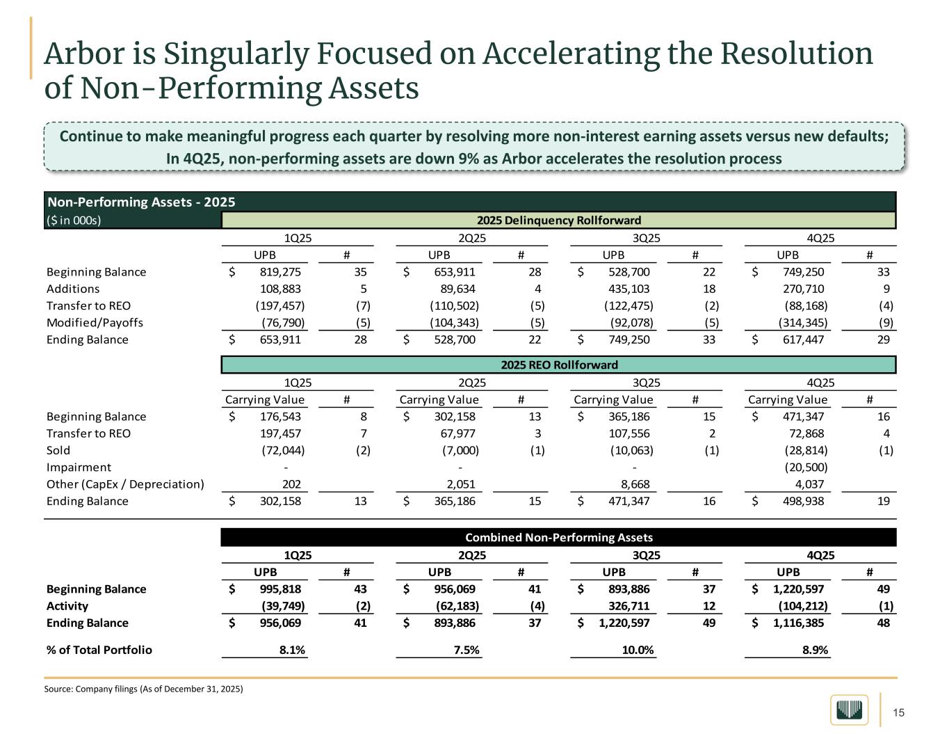 14 Source: Company filings (As of December 31, 2025) 1) No other individual state represented 4% or more of the total Arbor’s Loan Portfolio is Focused on the Highly Stable, Liquid and Resilient Multifamily Market LOAN TYPE ASSET CLASS GEOGRAPHICAL LOCATION ✓ Primary focus on stable multifamily senior loans Generates strong leveraged returns Geographically diversified Balance sheet business drives GSE/Agency pipeline ✓ ✓ ✓ PORTFOLIO OVERVIEW Bridge, 94% Mezz, 2% Pref Eq, 2% APC, 2% Multifamily, 73% Single-Family Rental, 26% Land, 1% TX, 23% FL, 17% GA, 7% NY, 8% AZ, 8% NC, 4% Other, 33%1 Total Portfolio $12.1B As of: 12/31/2025 Average loan size $19.2M W/A loan-to-value 77% Allowance for credit losses (CECL) 1% W/A mos. to maturity 14.7 W/A mos. to maturity w/ext. option 19.9