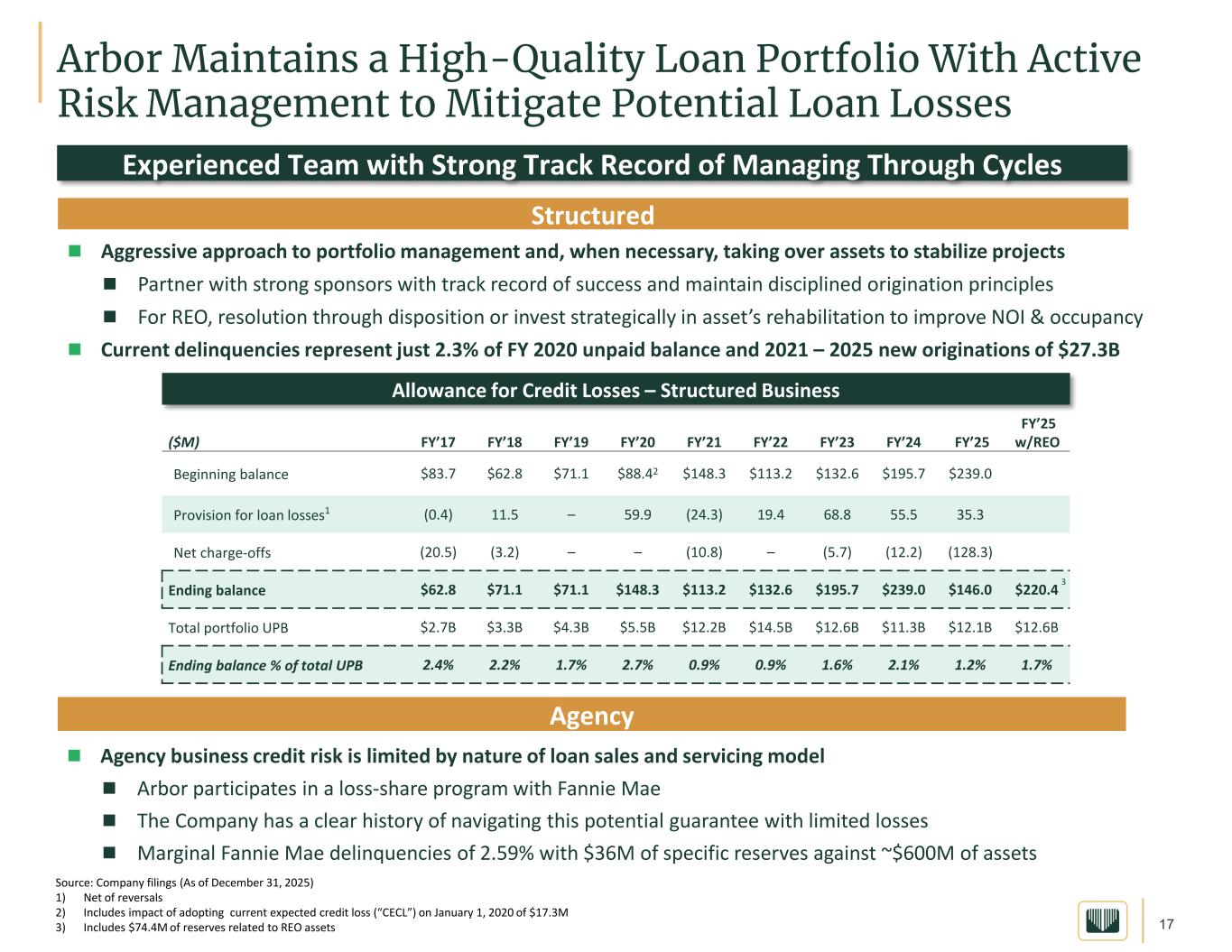 16 Arbor has Clear Visibility to Resolution on Non-Performing Assets Source: Company filings (As of December 31, 2025) 1) Assumes no new delinquencies Aggressive resolution strategy will go a long way towards improving Arbor’s run rate of net interest income as these non-performing assets are dragging earnings down by $80M - $100M annually, or ~$0.38 - $0.48 per share Projected Resolution for $617M of Delinquencies → $100M - $150M is expected to be resolved by the end of 1Q26 → Likely to rectify between $100M - $200M in 2Q26 → Throughout 2026, Arbor is projected to take back between $100M - $200M of non-performing loans as REO assets, as well as work through any remaining delinquencies → This aggressive resolution pace will resolve nearly all of these delinquencies by year end Projected Resolution for $499M of REO Assets → ~$50M - $75M of delinquent loans (noted above) taken back as REO in the first quarter → Additionally, from 2Q26 – 4Q26, Arbor is projected to take back between $50M - $125M of non- performing loans (noted above) as REO assets → We expect to resolve between $350M - $400M of these assets during the year, which will bring the REO balance down to ~$300M by the end of 2026 1
