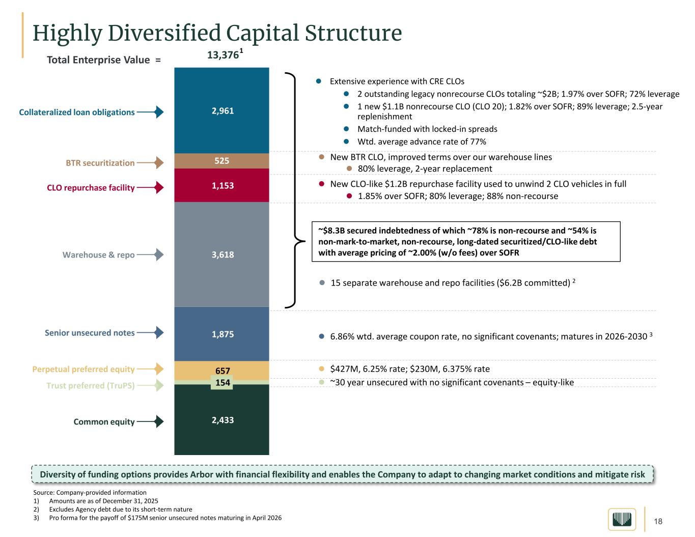 17 Arbor Maintains a High-Quality Loan Portfolio With Active Risk Management to Mitigate Potential Loan Losses Source: Company filings (As of December 31, 2025) 1) Net of reversals 2) Includes impact of adopting current expected credit loss (“CECL”) on January 1, 2020 of $17.3M 3) Includes $74.4M of reserves related to REO assets 5.7% Experienced Team with Strong Track Record of Managing Through Cycles ($M) FY’17 FY’18 FY’19 FY’20 FY’21 FY’22 FY’23 FY’24 FY’25 FY’25 w/REO Beginning balance $83.7 $62.8 $71.1 $88.42 $148.3 $113.2 $132.6 $195.7 $239.0 Provision for loan losses1 (0.4) 11.5 – 59.9 (24.3) 19.4 68.8 55.5 35.3 Net charge-offs (20.5) (3.2) – – (10.8) – (5.7) (12.2) (128.3) Ending balance $62.8 $71.1 $71.1 $148.3 $113.2 $132.6 $195.7 $239.0 $146.0 $220.4 Total portfolio UPB $2.7B $3.3B $4.3B $5.5B $12.2B $14.5B $12.6B $11.3B $12.1B $12.6B Ending balance % of total UPB 2.4% 2.2% 1.7% 2.7% 0.9% 0.9% 1.6% 2.1% 1.2% 1.7% Structured Aggressive approach to portfolio management and, when necessary, taking over assets to stabilize projects Partner with strong sponsors with track record of success and maintain disciplined origination principles For REO, resolution through disposition or invest strategically in asset’s rehabilitation to improve NOI & occupancy Current delinquencies represent just 2.3% of FY 2020 unpaid balance and 2021 – 2025 new originations of $27.3B Structured Allowance for Credit Losses – Structured Business Agency Agency business credit risk is limited by nature of loan sales and servicing model Arbor participates in a loss-share program with Fannie Mae The Company has a clear history of navigating this potential guarantee with limited losses Marginal Fannie Mae delinquencies of 2.59% with $36M of specific reserves against ~$600M of assets 3